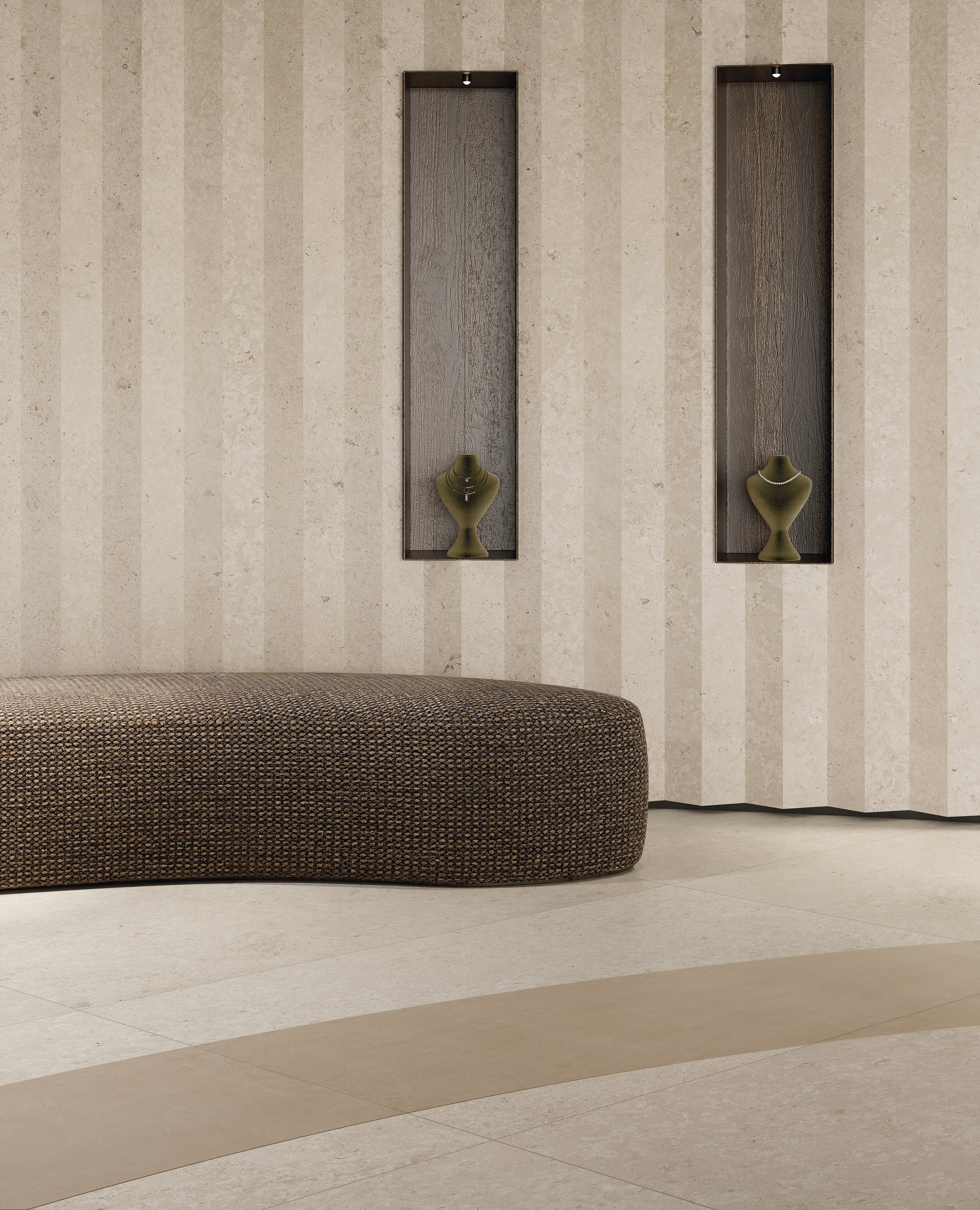 A journey through material, punctuated by traces of light. Jatoba Brown is a sophisticated surface with a dark brown background crossed by lighter veins in warm, iron-like tones. It evokes wood and its golden reflections, which illuminate and enrich the texture. Enhanced by a honed finish that offers a pleasing glossy-matte contrast, Jatoba Brown is ideal for floors and wall coverings, as well as exterior facades. Available in both classic and Maximum formats.