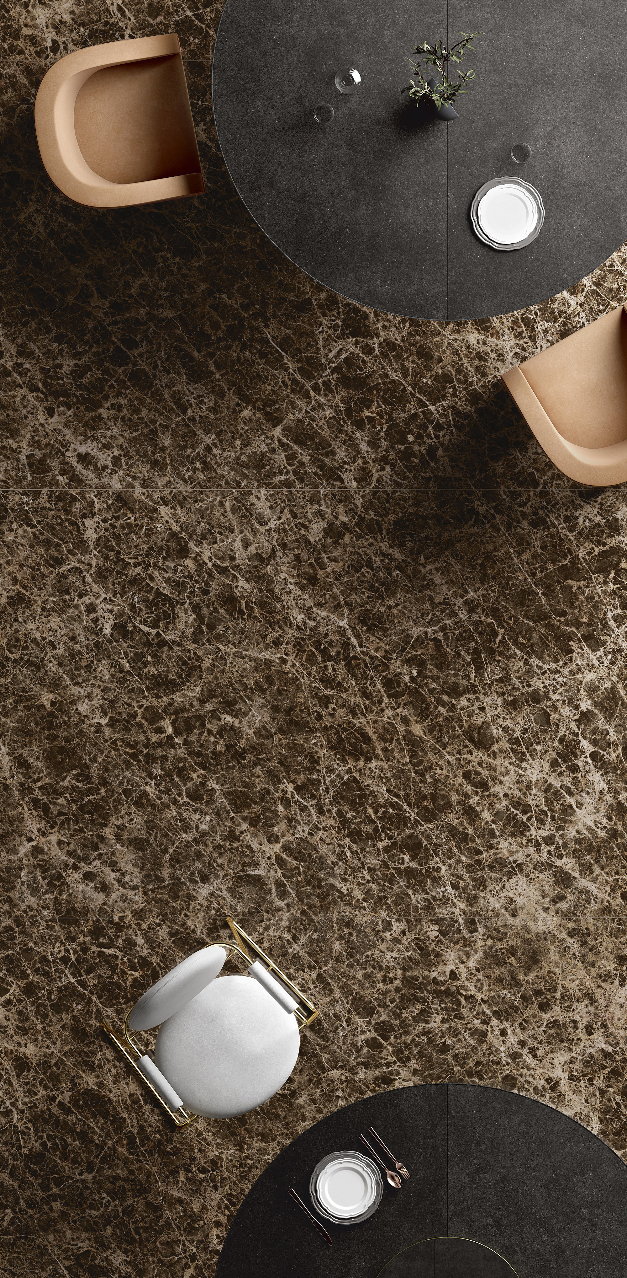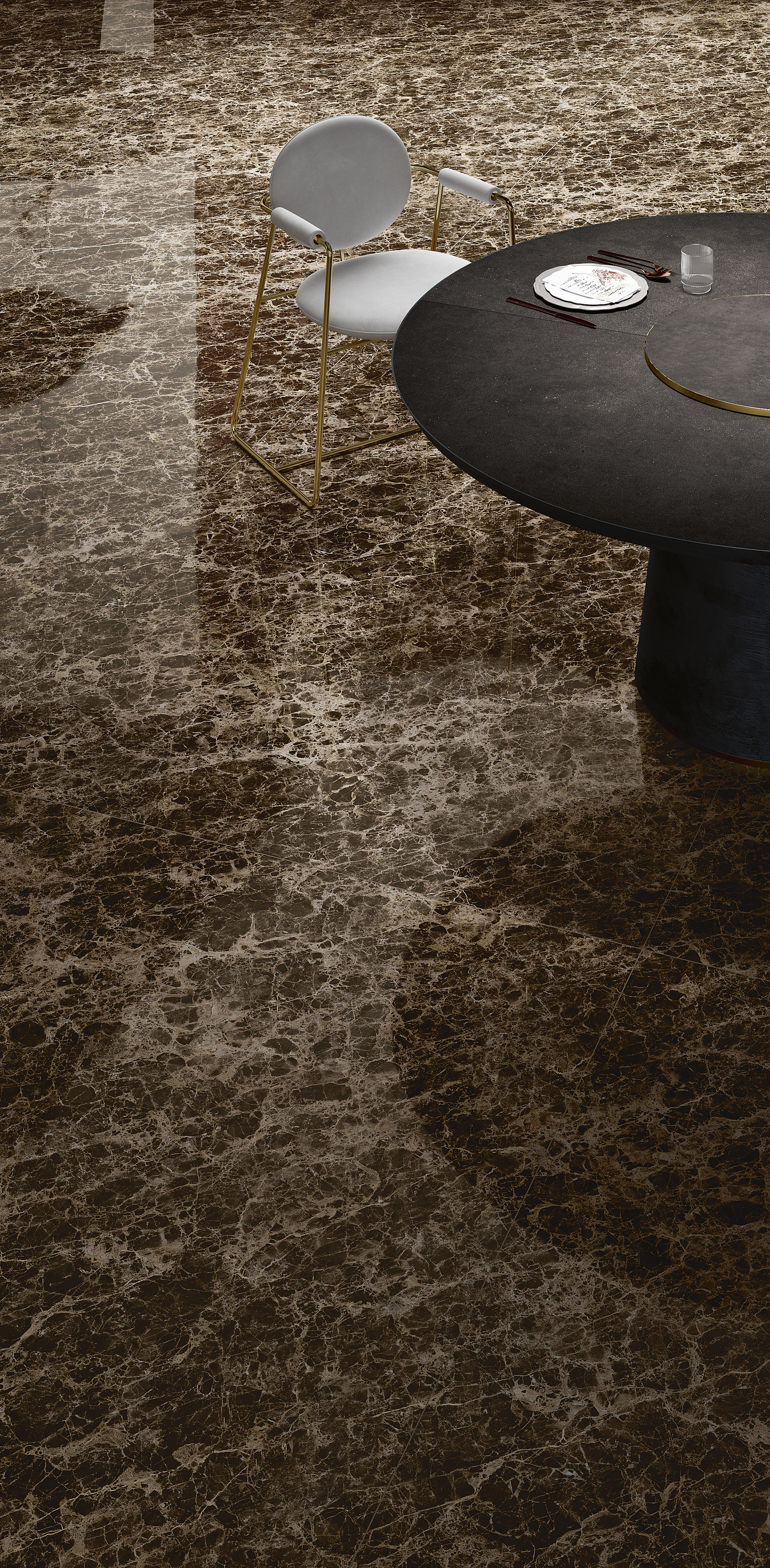 Deep Emperador is characterized by a stunning dark brown, almost black color, with warm hazelnut, cream, and caramel veins. Its golden shades and iridescent highlights make spaces elegant and exclusive. Deep Emperador is ideal for indoor floors and wall coverings, exterior facades, and refined, contemporary decorative furnishings.