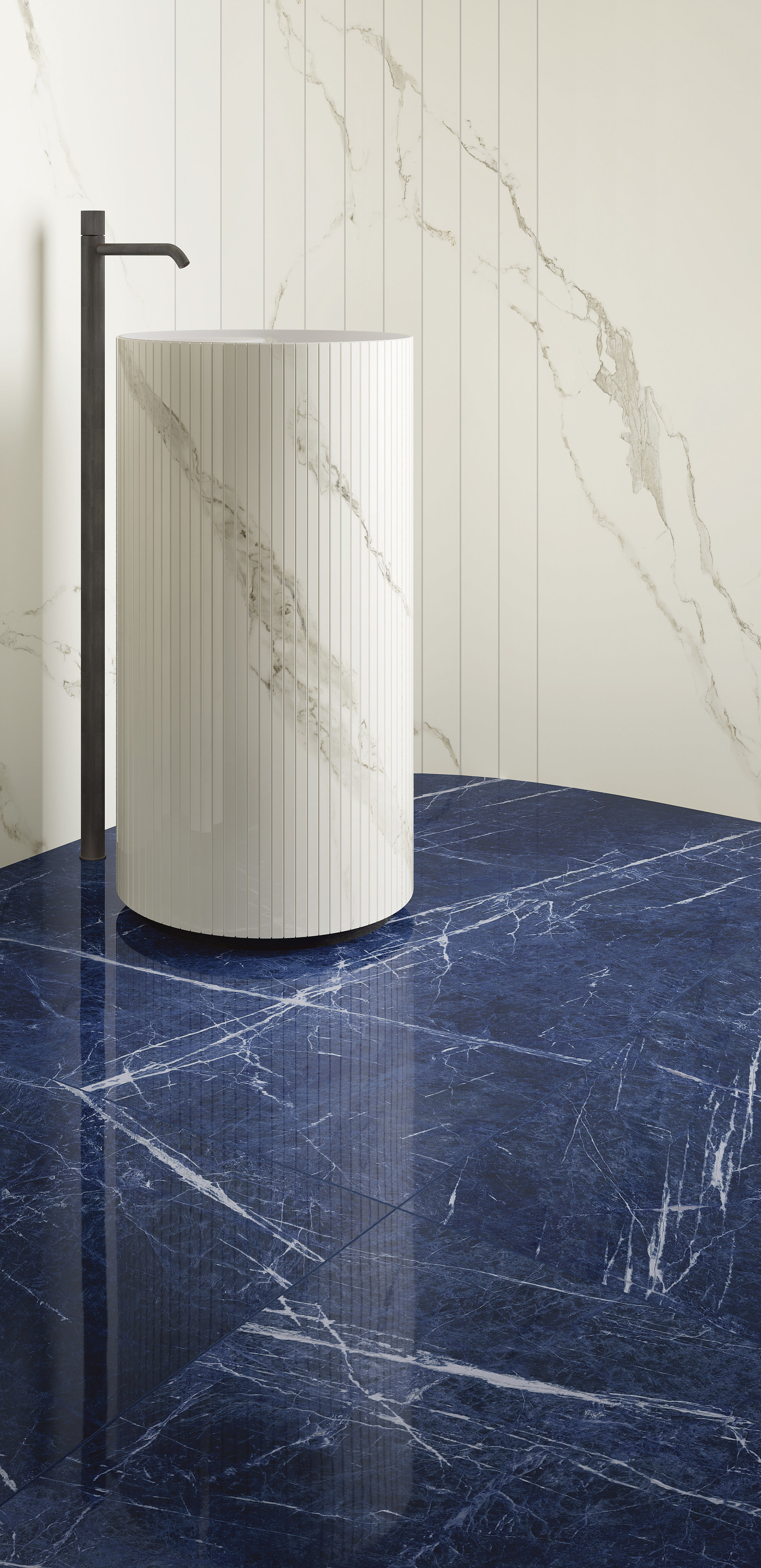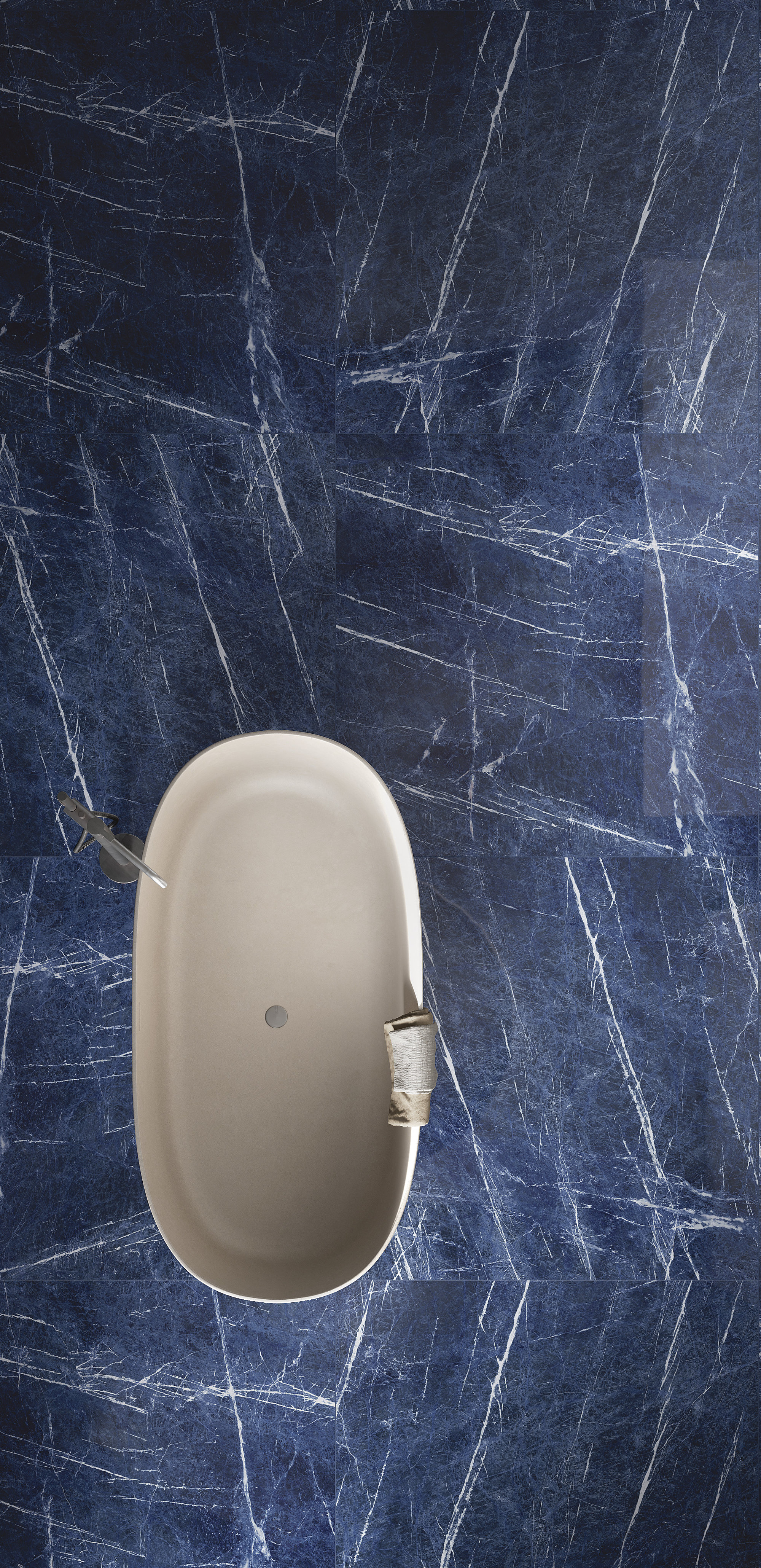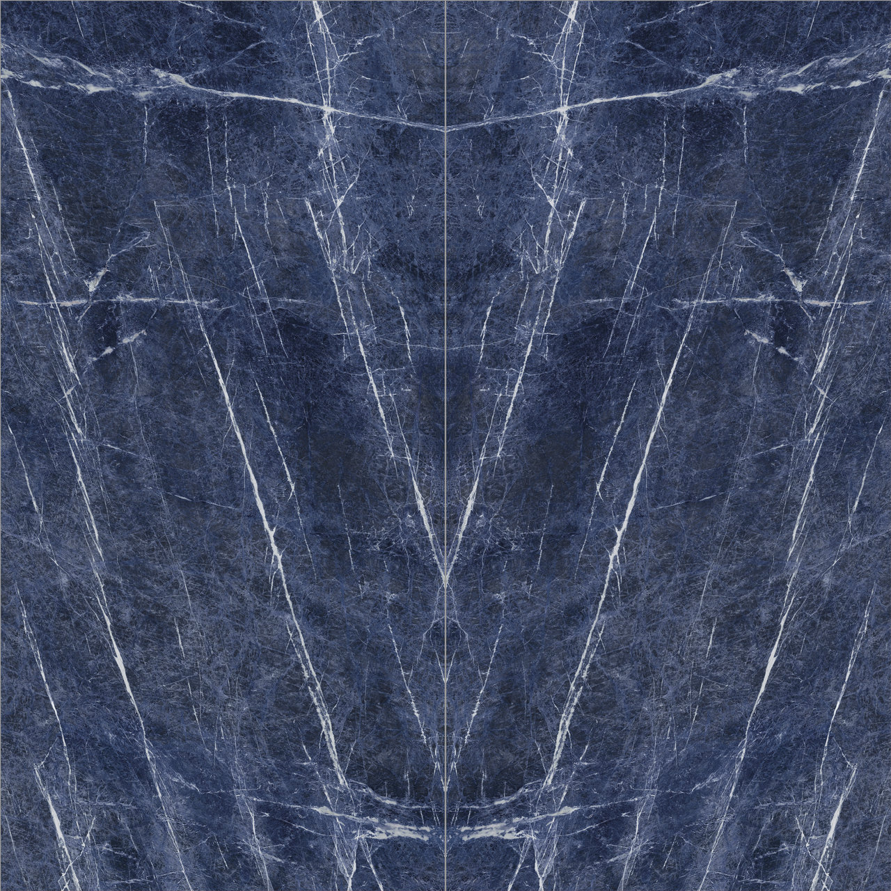 This marble-effect porcelain stoneware surface features a deep blue base, enriched with fine white veins that create a refined and dynamic contrast. The irregular, luminous veins evoke the appearance of precious marble, giving spaces a sophisticated and contemporary atmosphere. Also available in an 'open vein' (book-match) version.