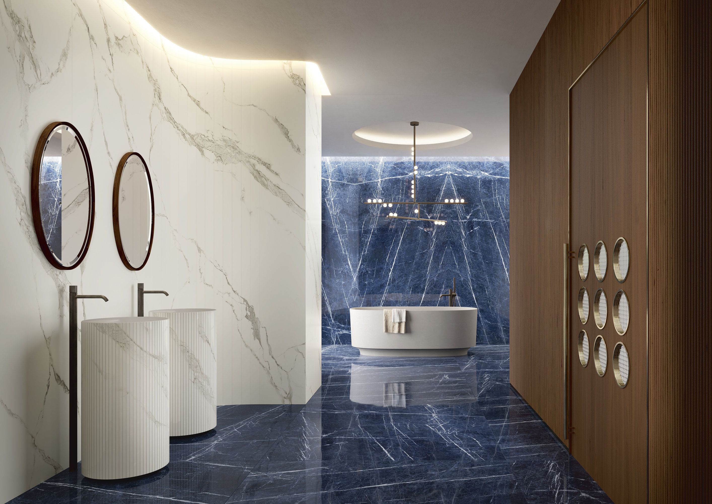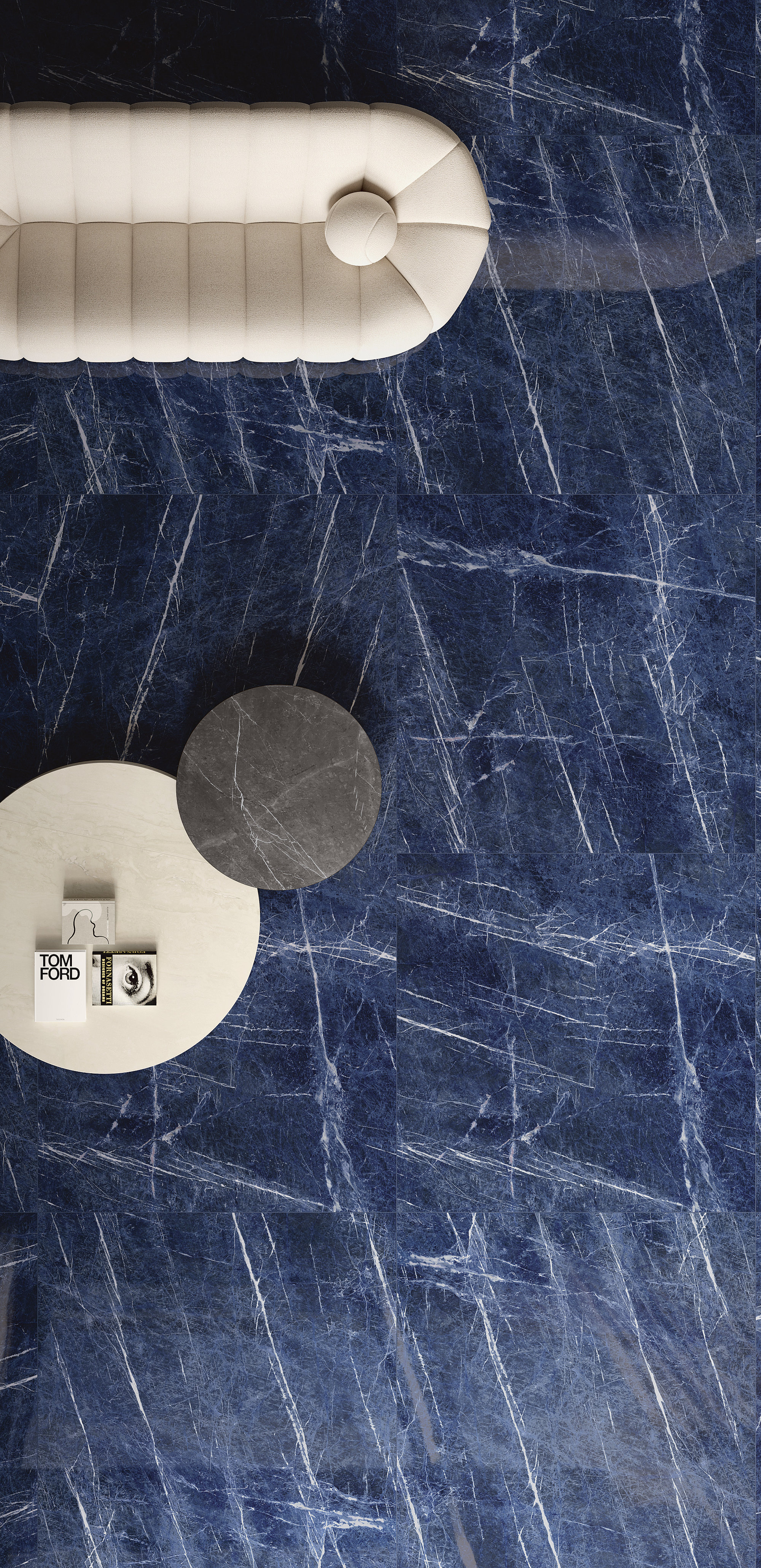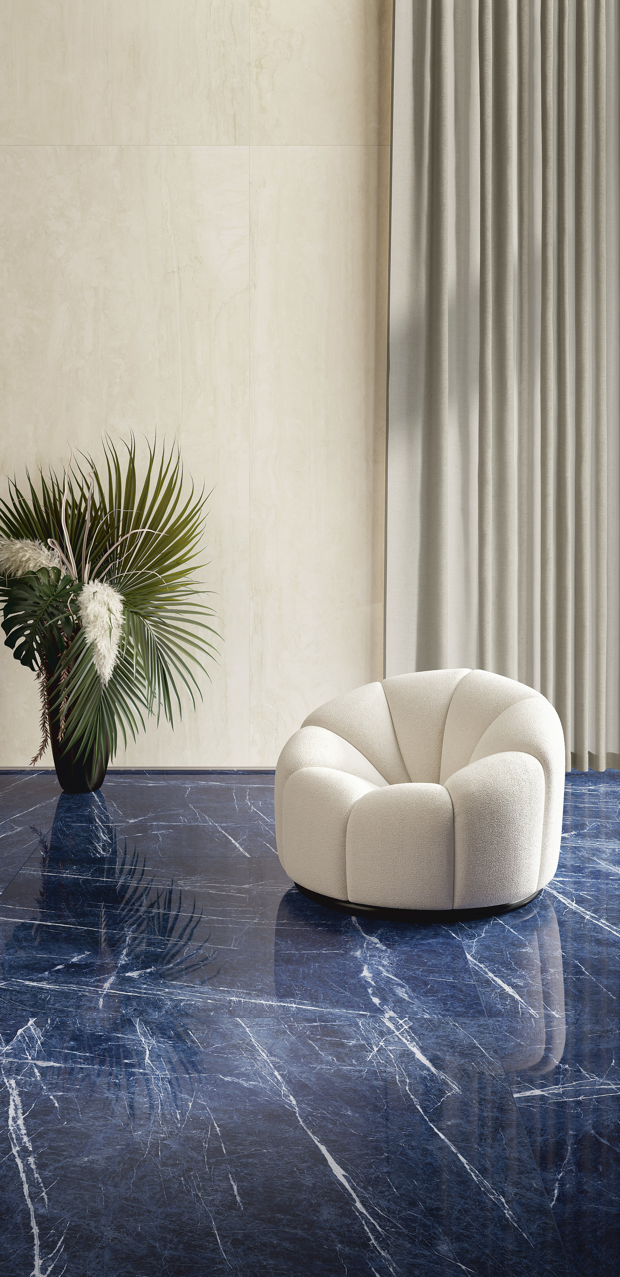 This marble-effect porcelain stoneware surface features a deep blue base, enriched with fine white veins that create a refined and dynamic contrast. The irregular, luminous veins evoke the appearance of precious marble, giving spaces a sophisticated and contemporary atmosphere. Also available in an 'open vein' (book-match) version.