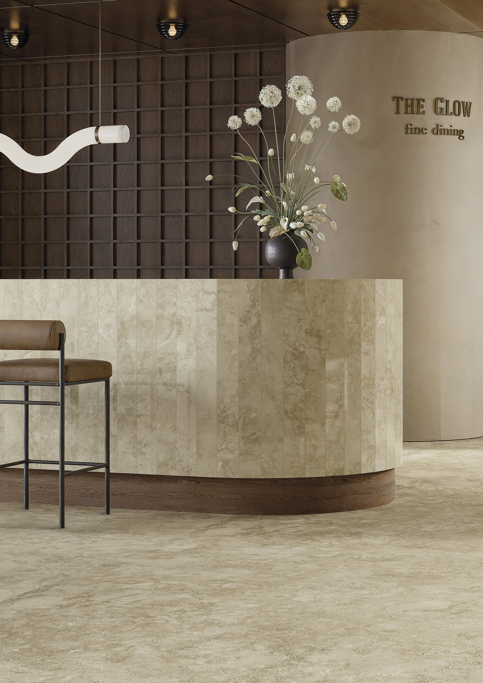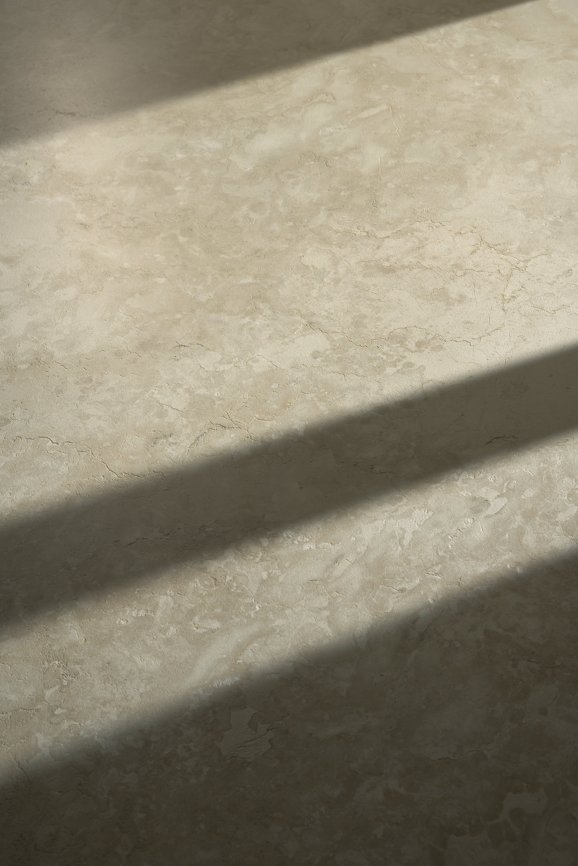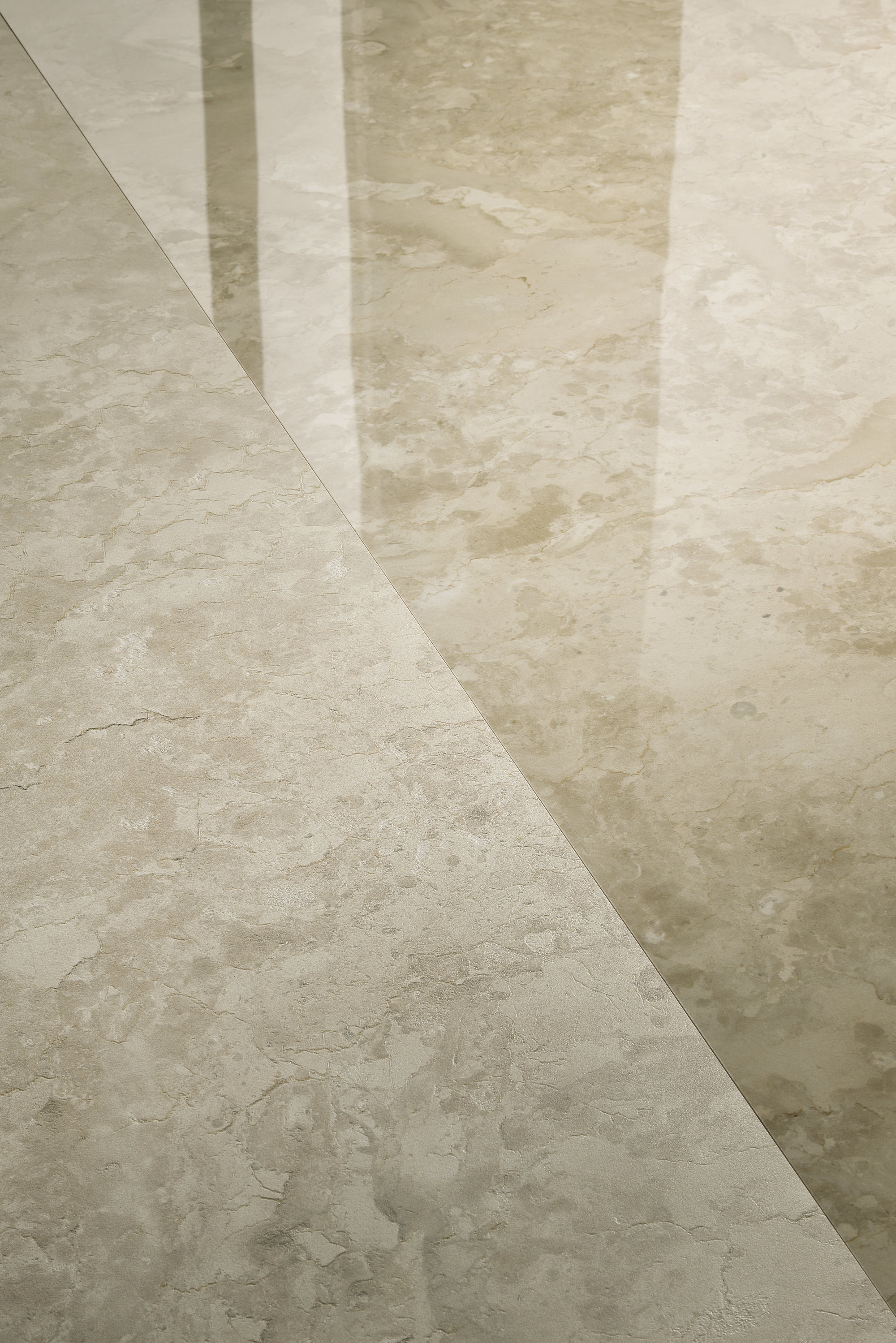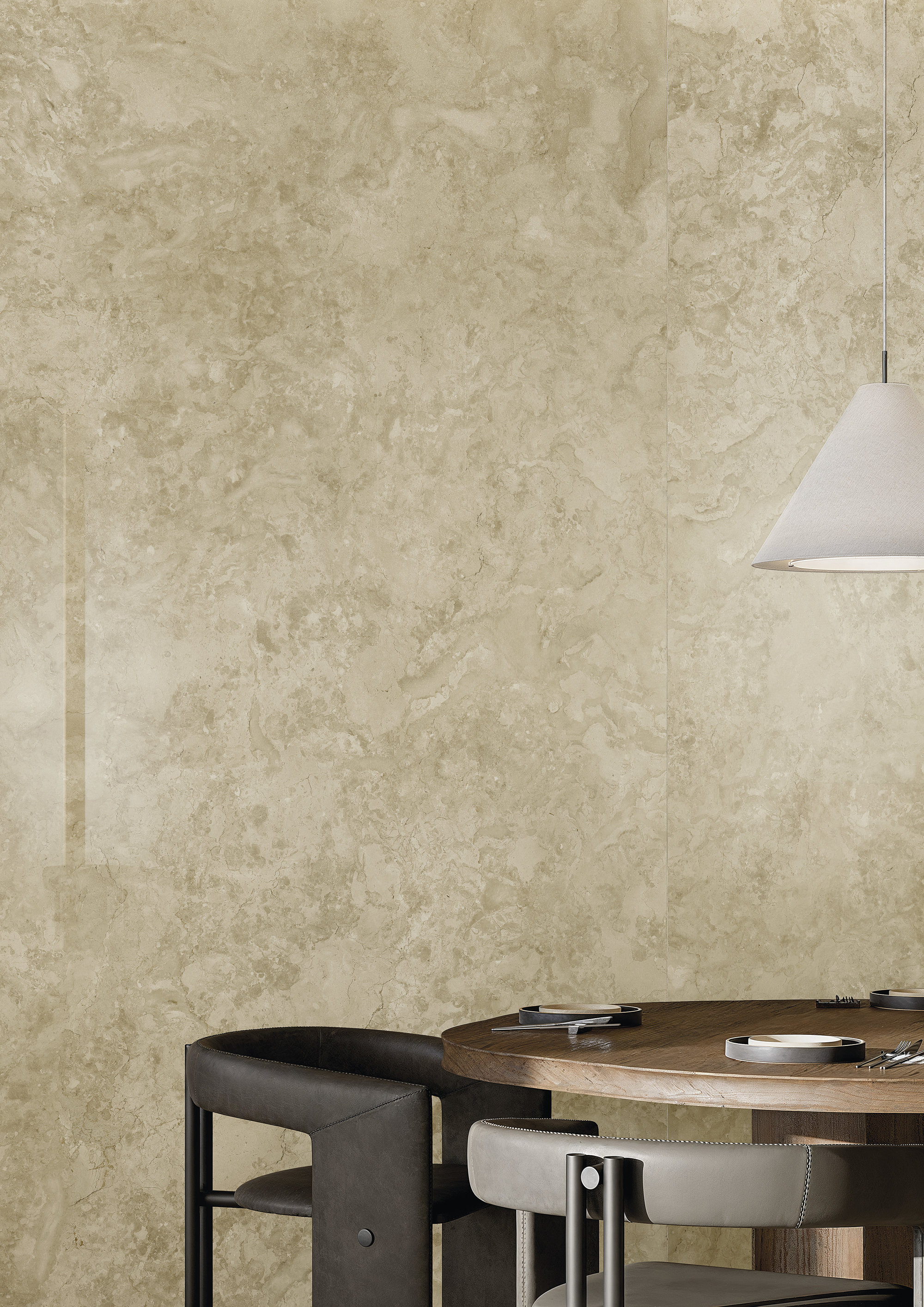 A beige background streaked with a pattern of delicate veining, inspired by Italian limestone marbles. A surface that combines sobriety and movement through its intricate and irregular textures, achieving a balanced and natural effect. Fiorenza is available in the Natural finish, matte and tactile, with perfectly matching graphics and relief, and in the Polished extra-glossy finish, which enhances its chromatic depth and the richness of the design. This Maximum format surface is produced with water-based technology: excellent aesthetic rendering, high image definition, and material effect, all in line with environmental sustainability.