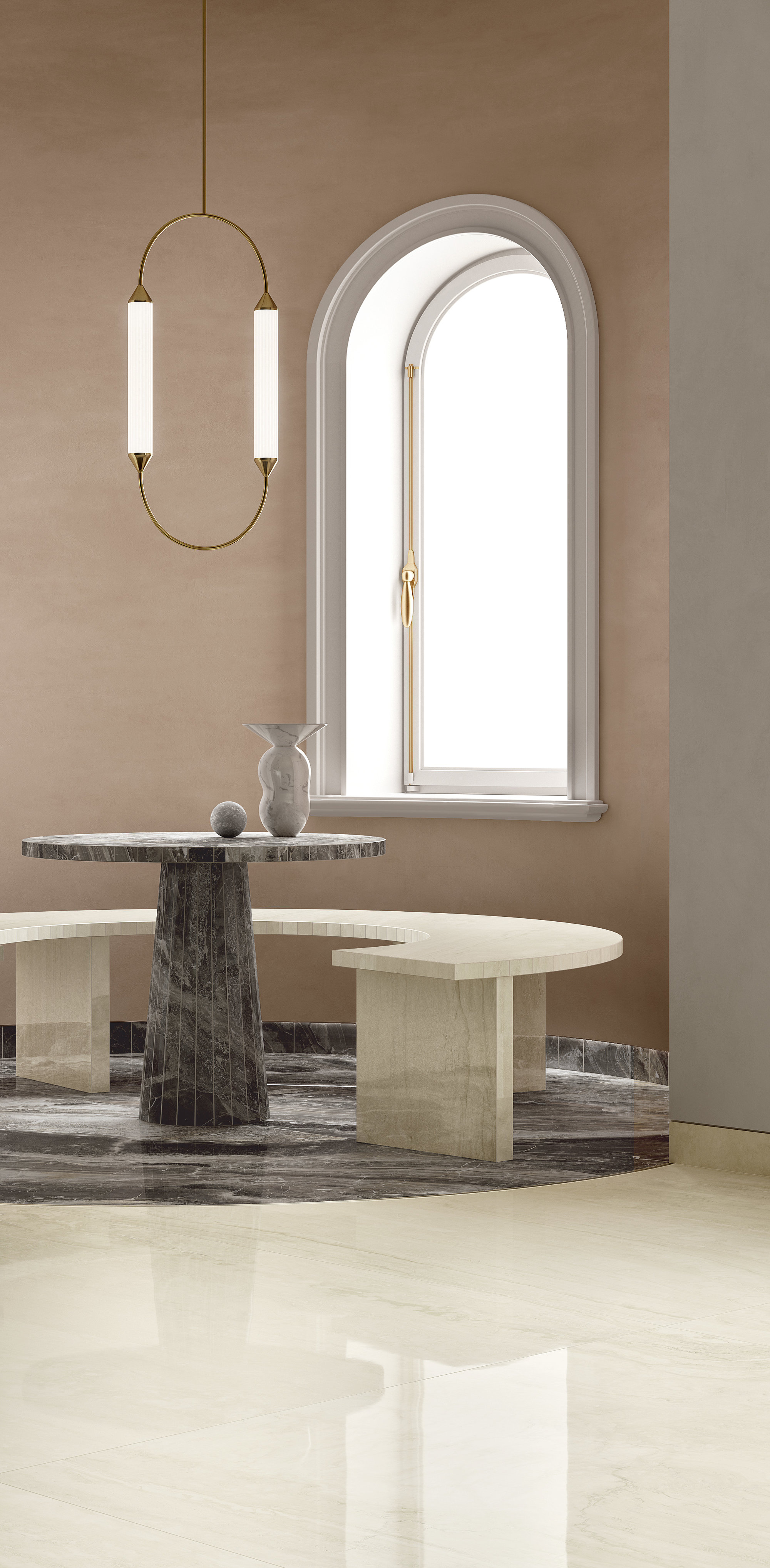 Shades of white, combined with varying tones of gray and brown and subtle ochre hues, give Orobico Arabescato a lively and sinuous appearance. The polished finish highlights this surface in all its preciousness; also available in an open-vein (book-match) version, Arabescato Orobico is the ideal choice for prestigious architecture and interiors, whether residential, commercial, or public. In addition to flooring and wall applications, it can also be used to customize furnishings and architectural details.