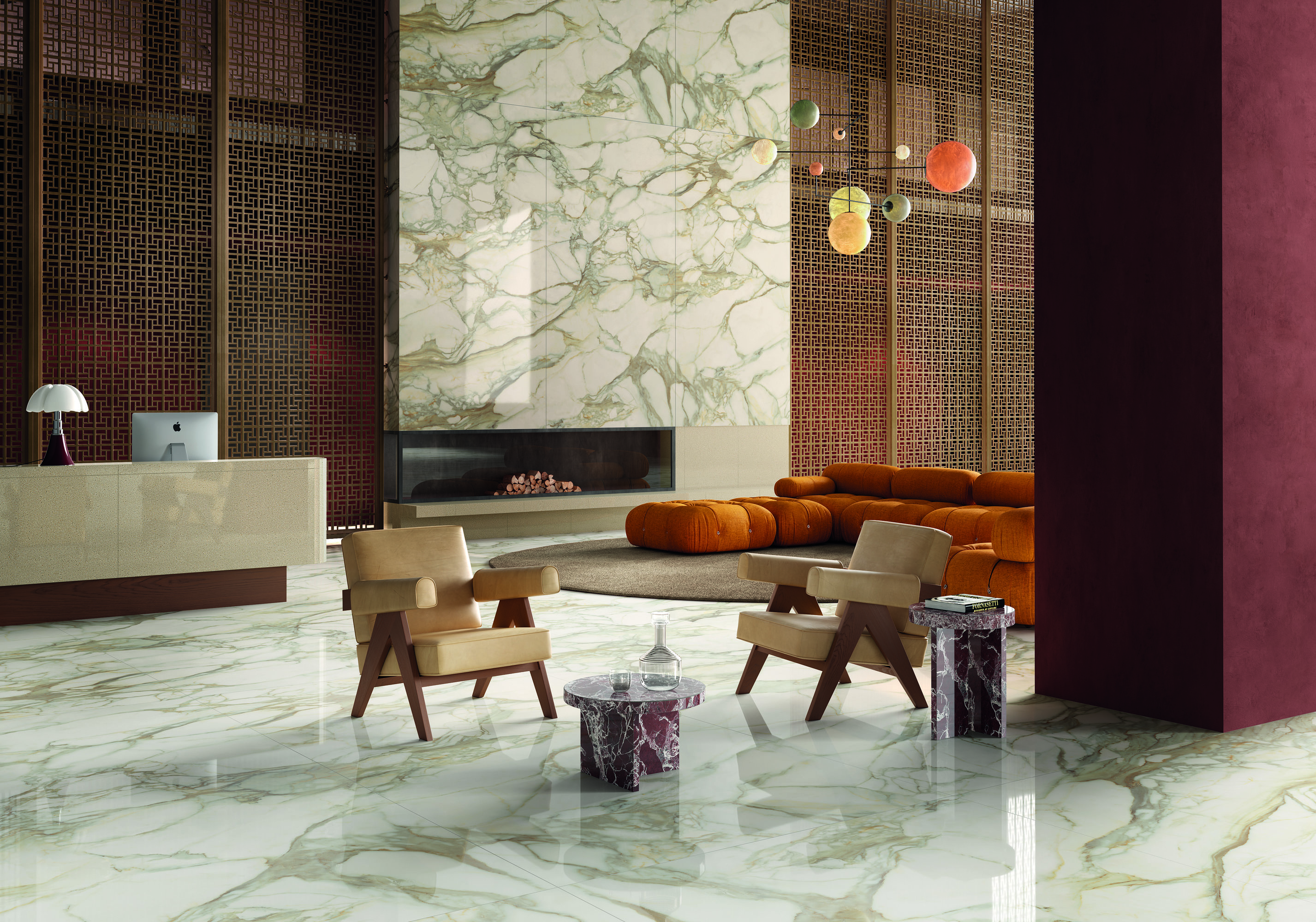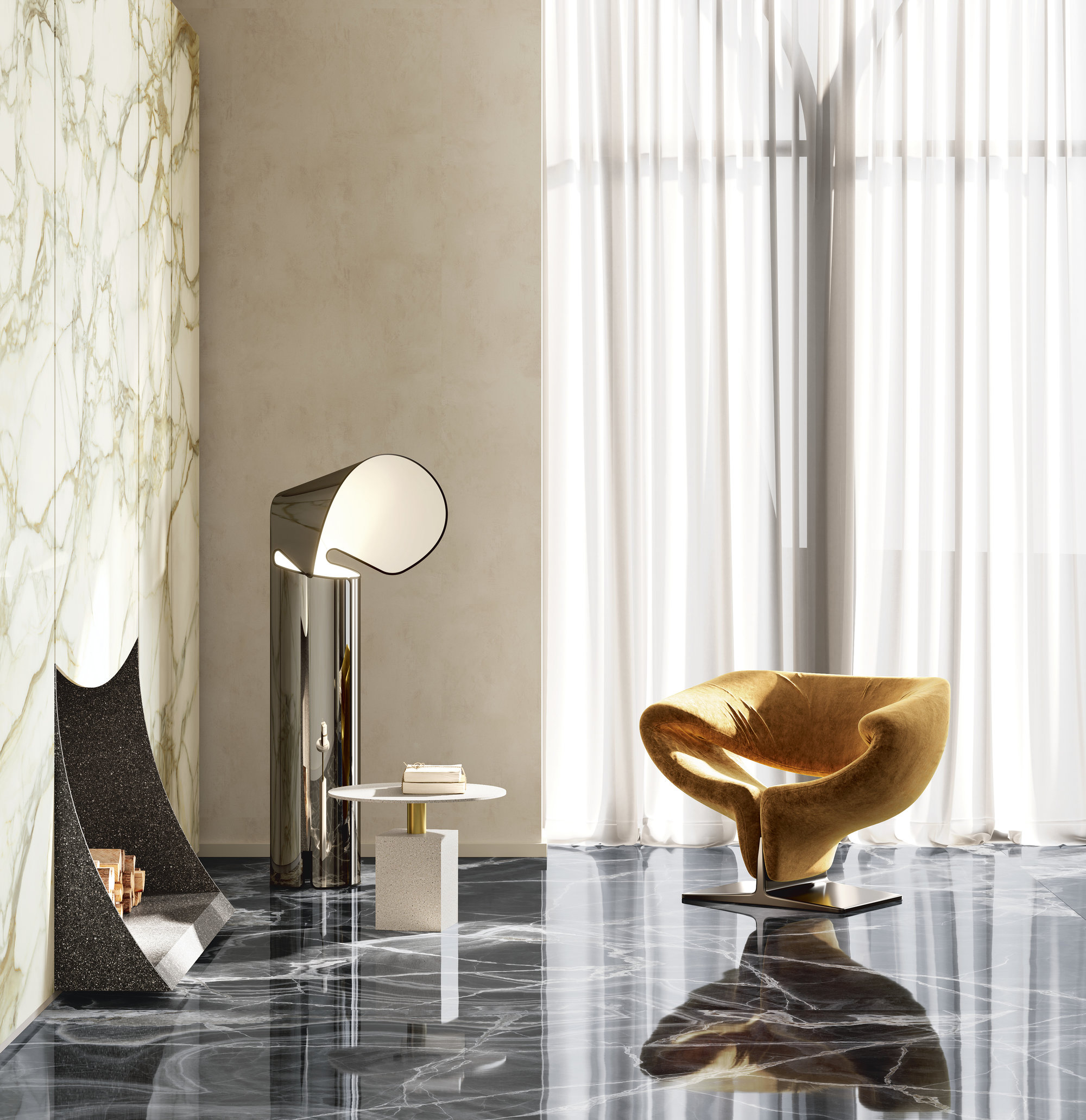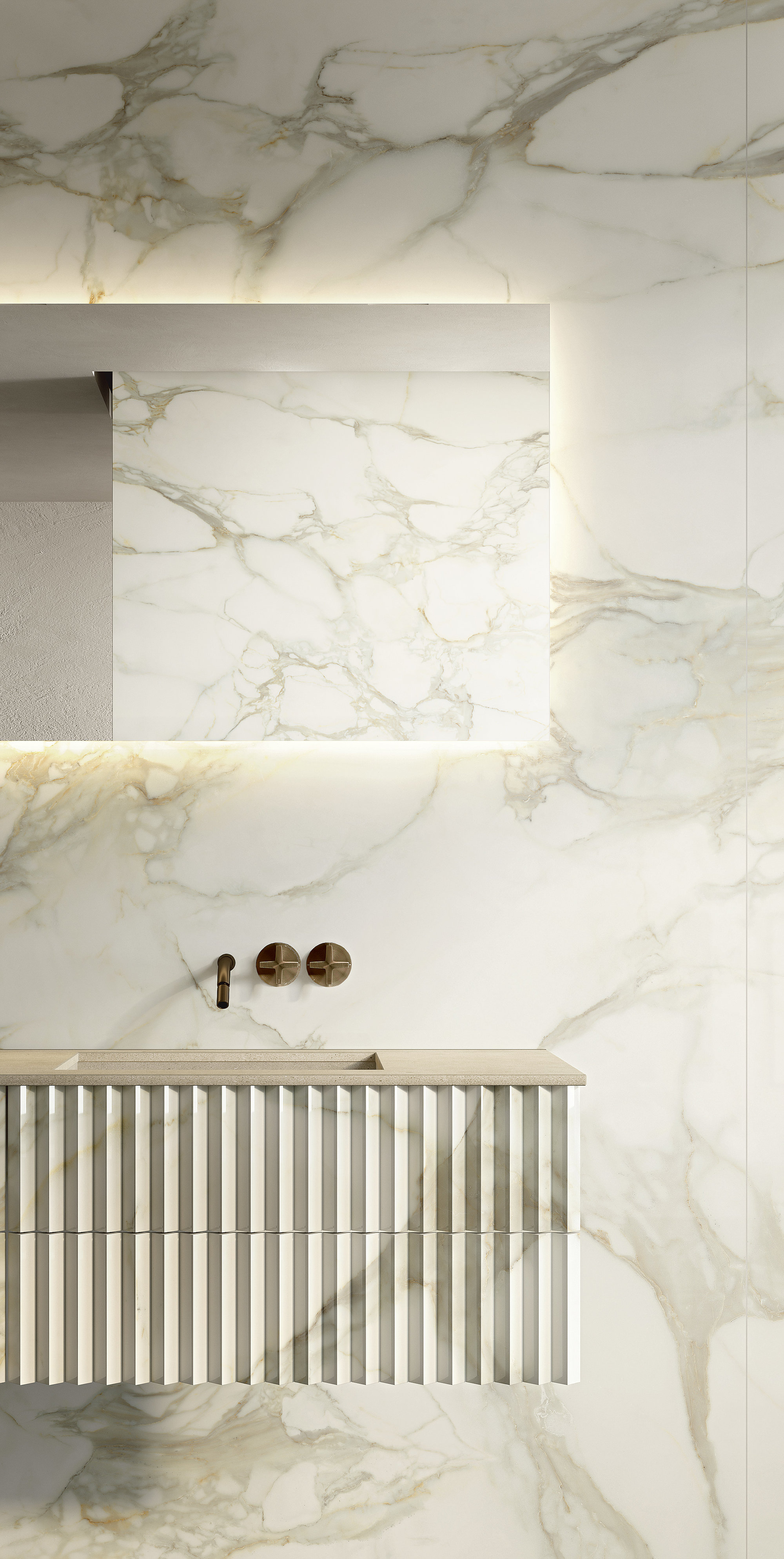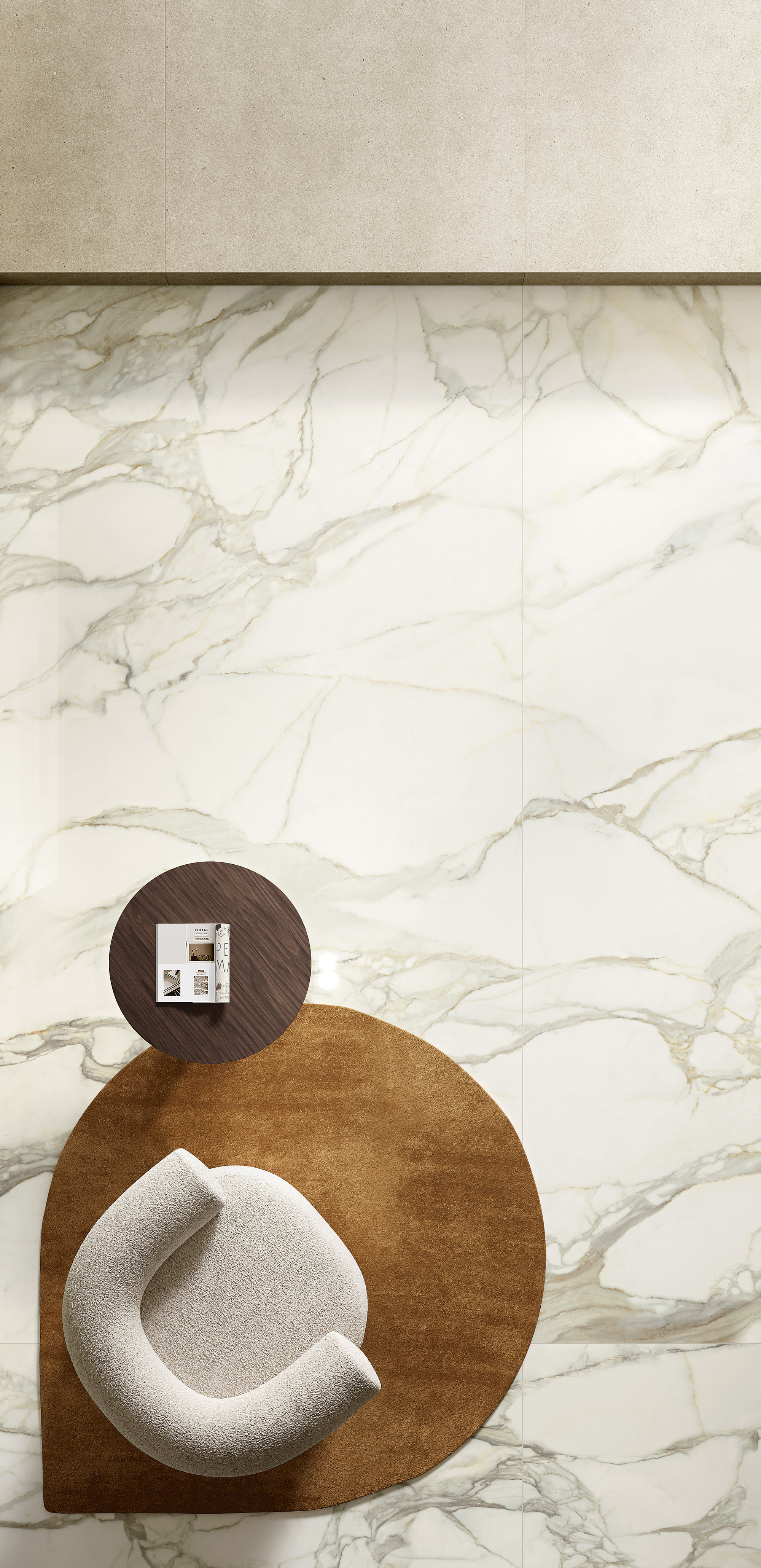 Calacatta Dorato captures attention with golden, deep, and sinuous veins that bring warmth, movement, and refinement to spaces. This ceramic surface is ideal for enhancing private residences, commercial projects, and hospitality environments, where design quality must not compromise functionality, durability, or ease of maintenance. The Polished finish adds brightness and shine to the texture, while the Natural finish provides a matte, more contemporary look. Available in both classic and Maximum formats.