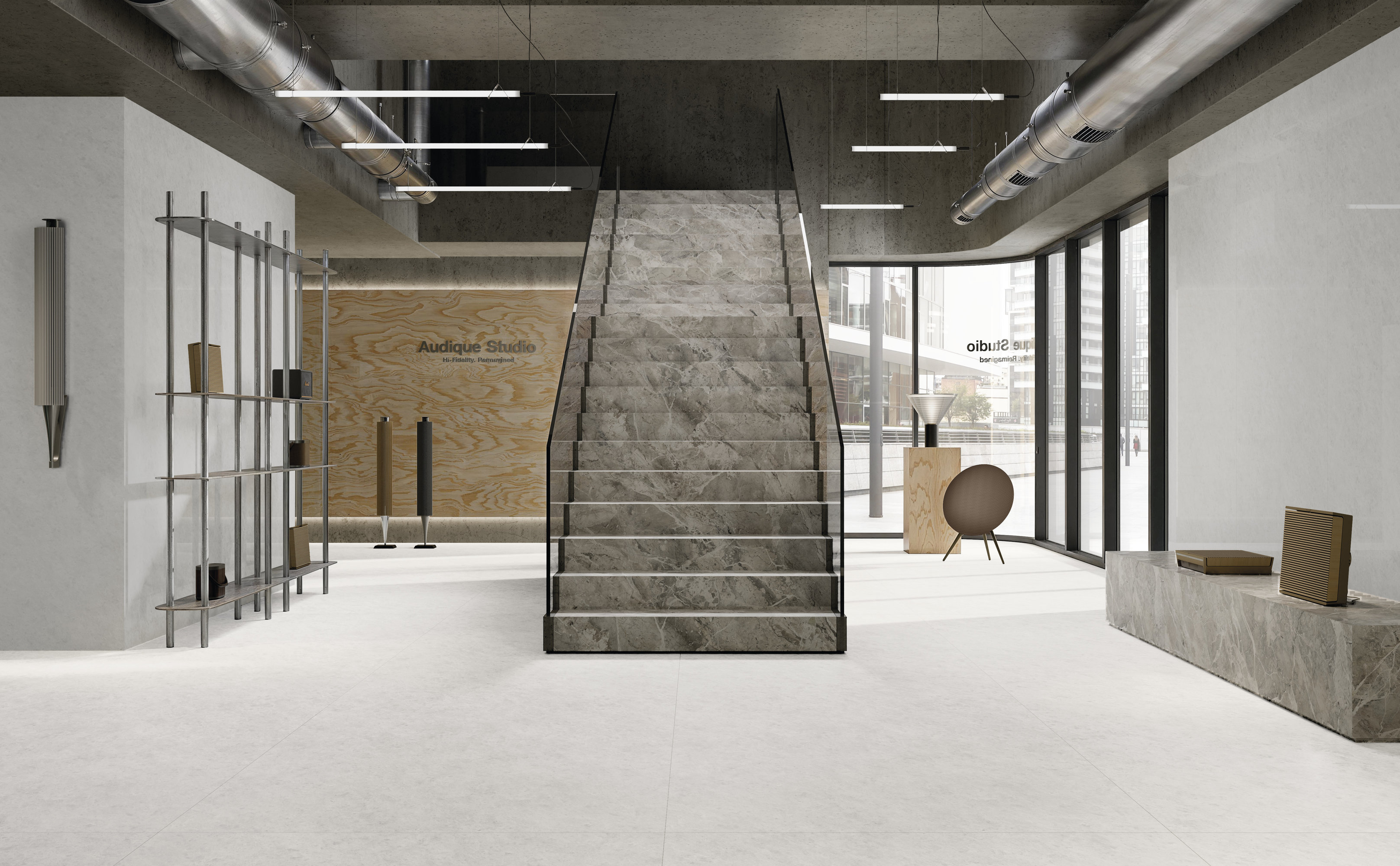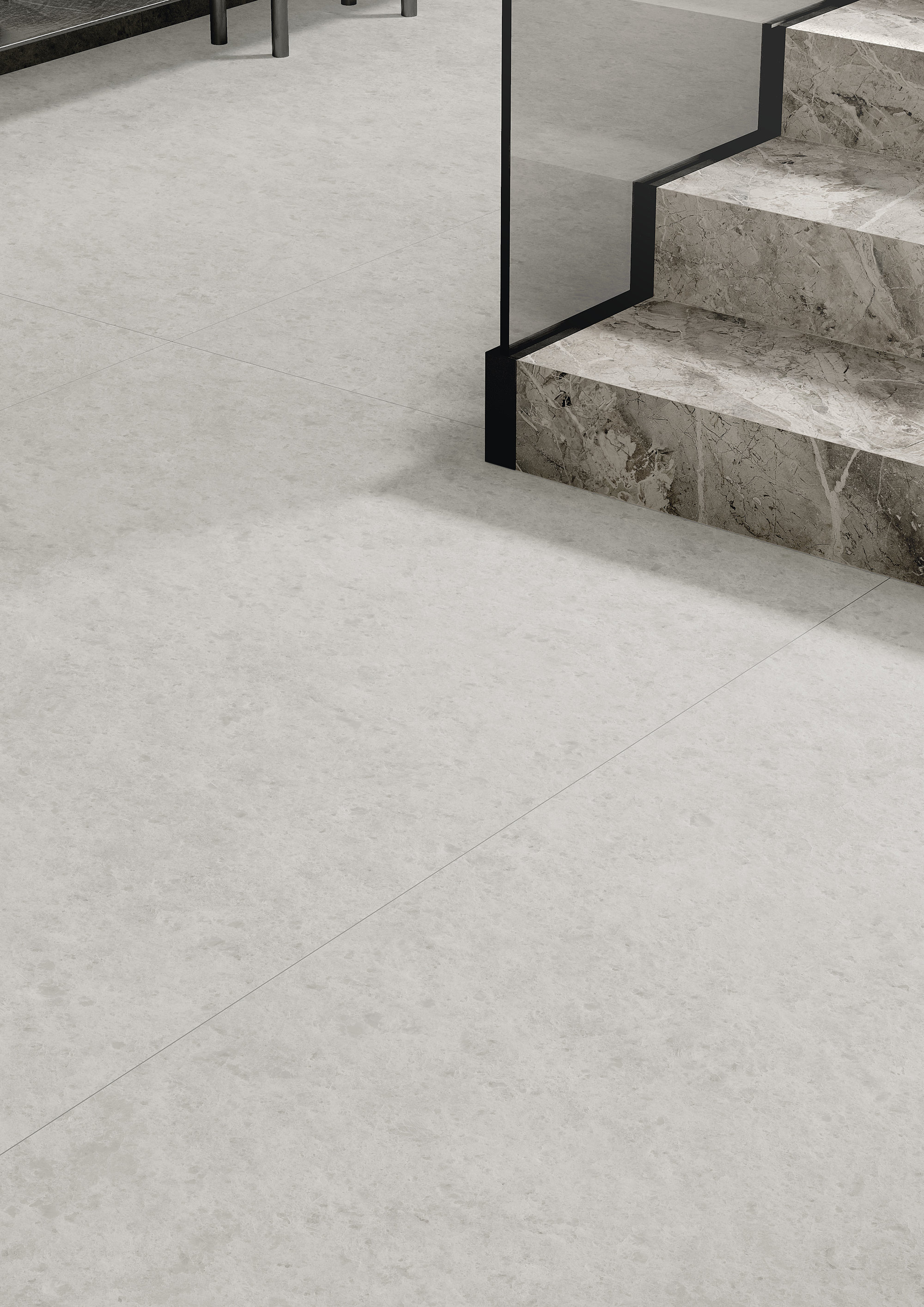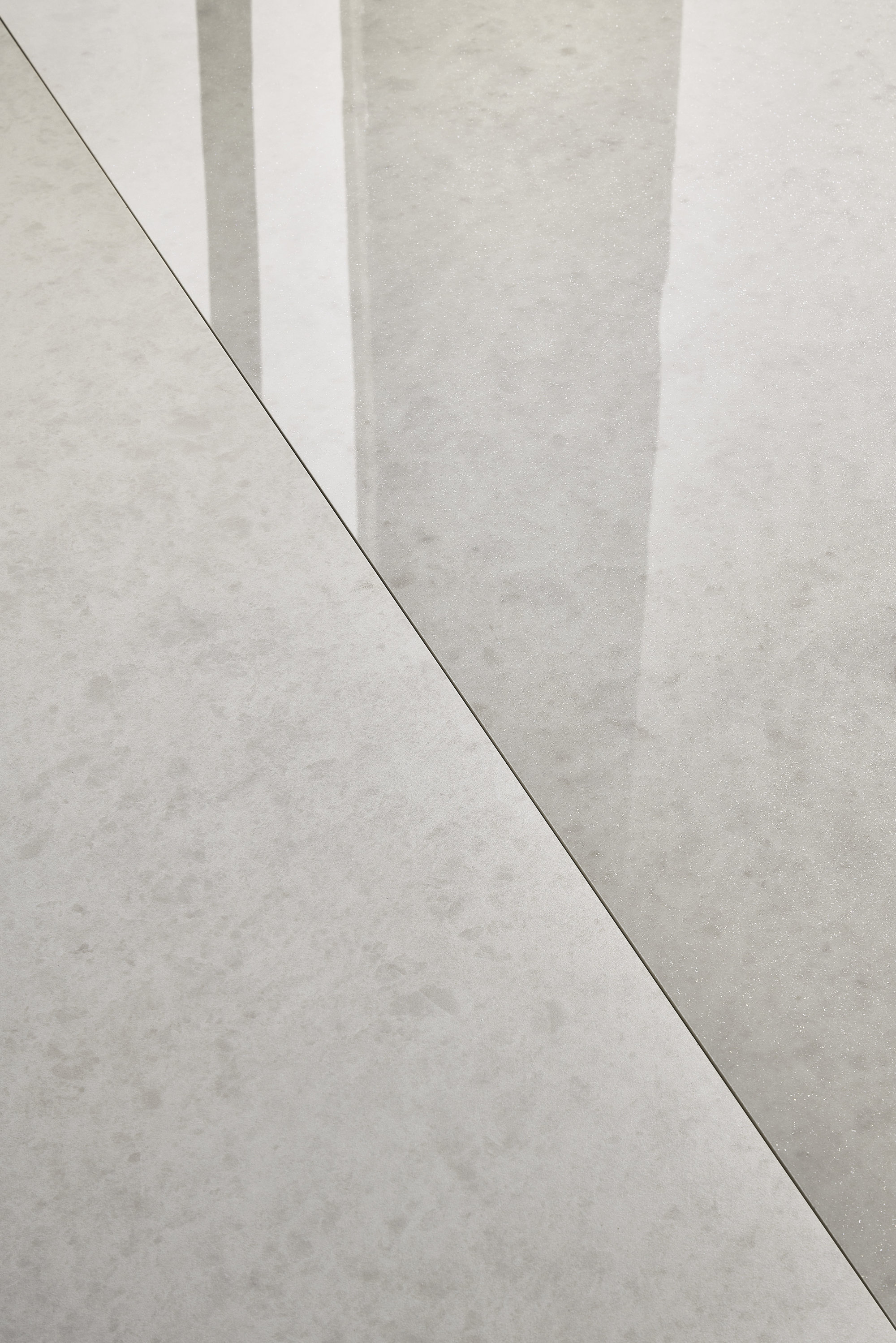 A surface inspired by natural opal, characterized by a bright white background with delicate shades ranging from grey to soft blue. The crystalline texture conveys a sense of depth, reminiscent of the partial transparency and reflections of the original stone. Available in Glint finish, glossy with small and subtle luminous inclusions that enhance brilliance, and in Feel finish, homogeneous and velvety with a uniform matte effect. This Maximum format surface is produced with water-based technology: excellent aesthetic rendering, high image definition, and material effect, all in line with environmental sustainability.