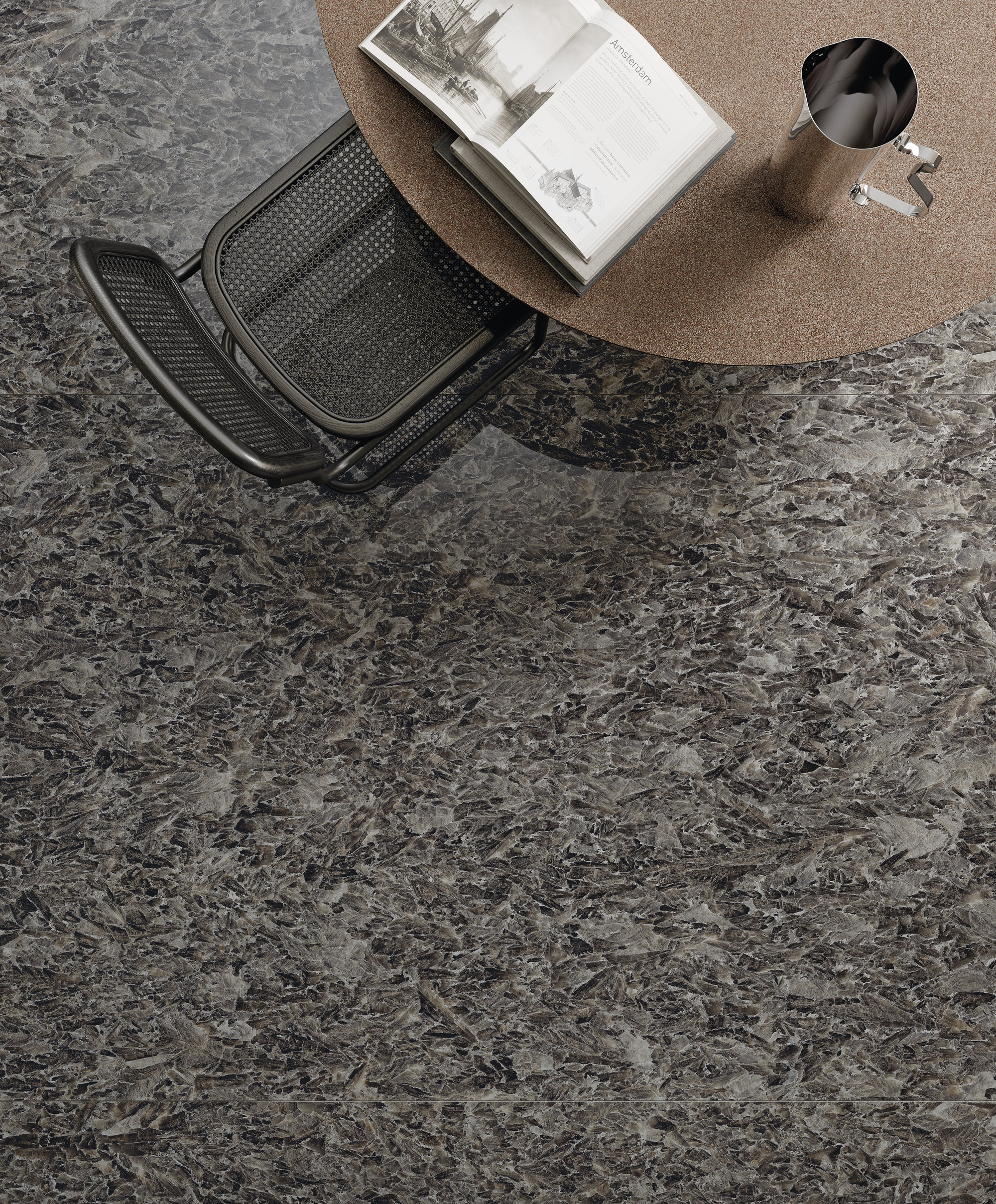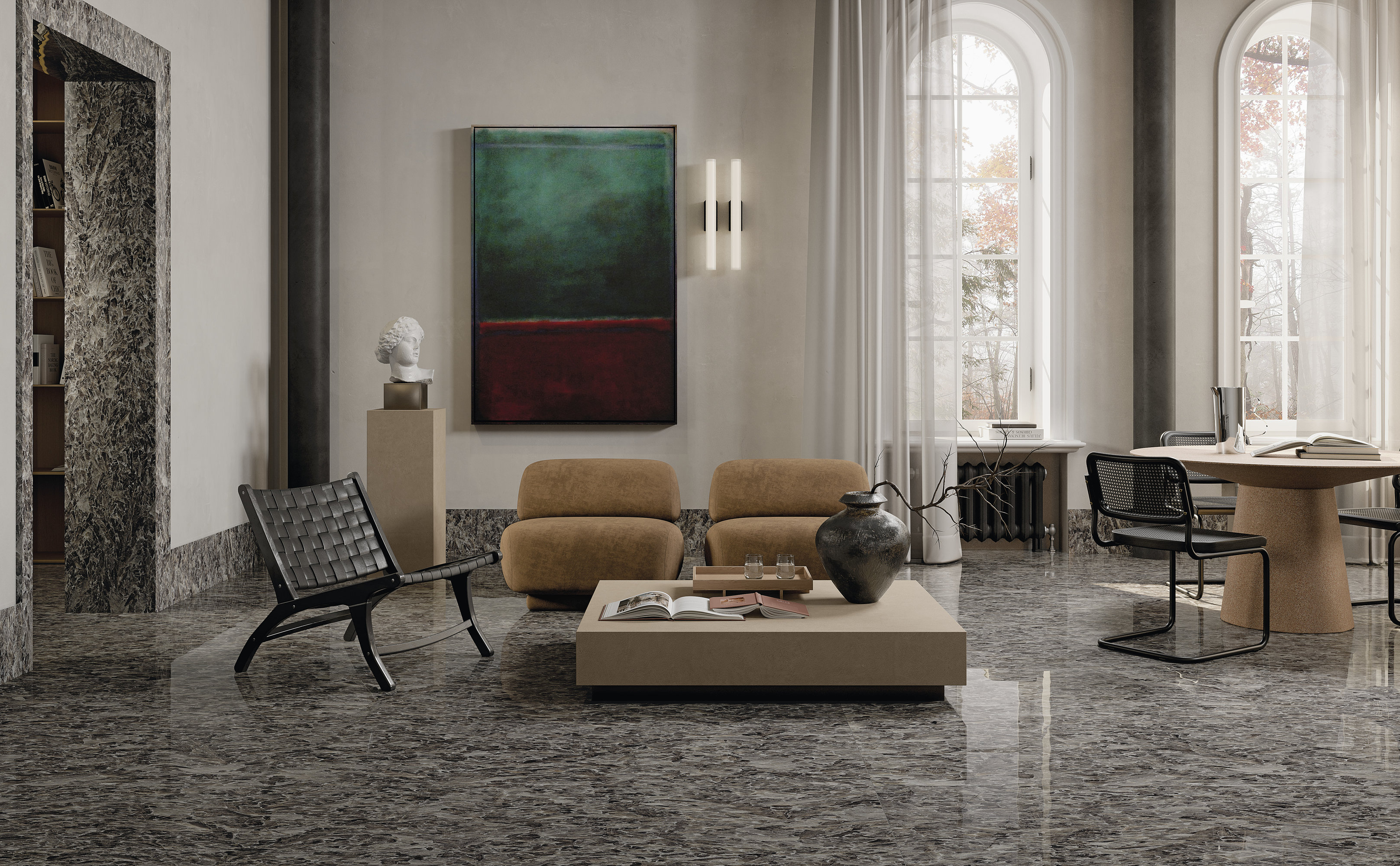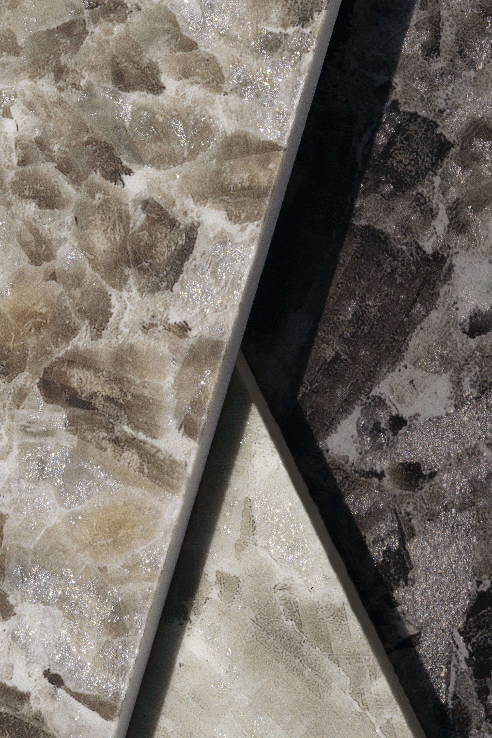 Black is brightened up with subtle lighter inserts, giving spaces new elegance and a touch of austerity. Visually engaging with their crystalline reflections, these surfaces surprise the viewer with their graphic lines, while the exclusive Jewel finish, with its alchemic combination of an iridescent mineral and a glassy material, underlines the luminous fragments and gives the ceramic material an even clearer, more intense appearance, evoking an exciting architectural experience.