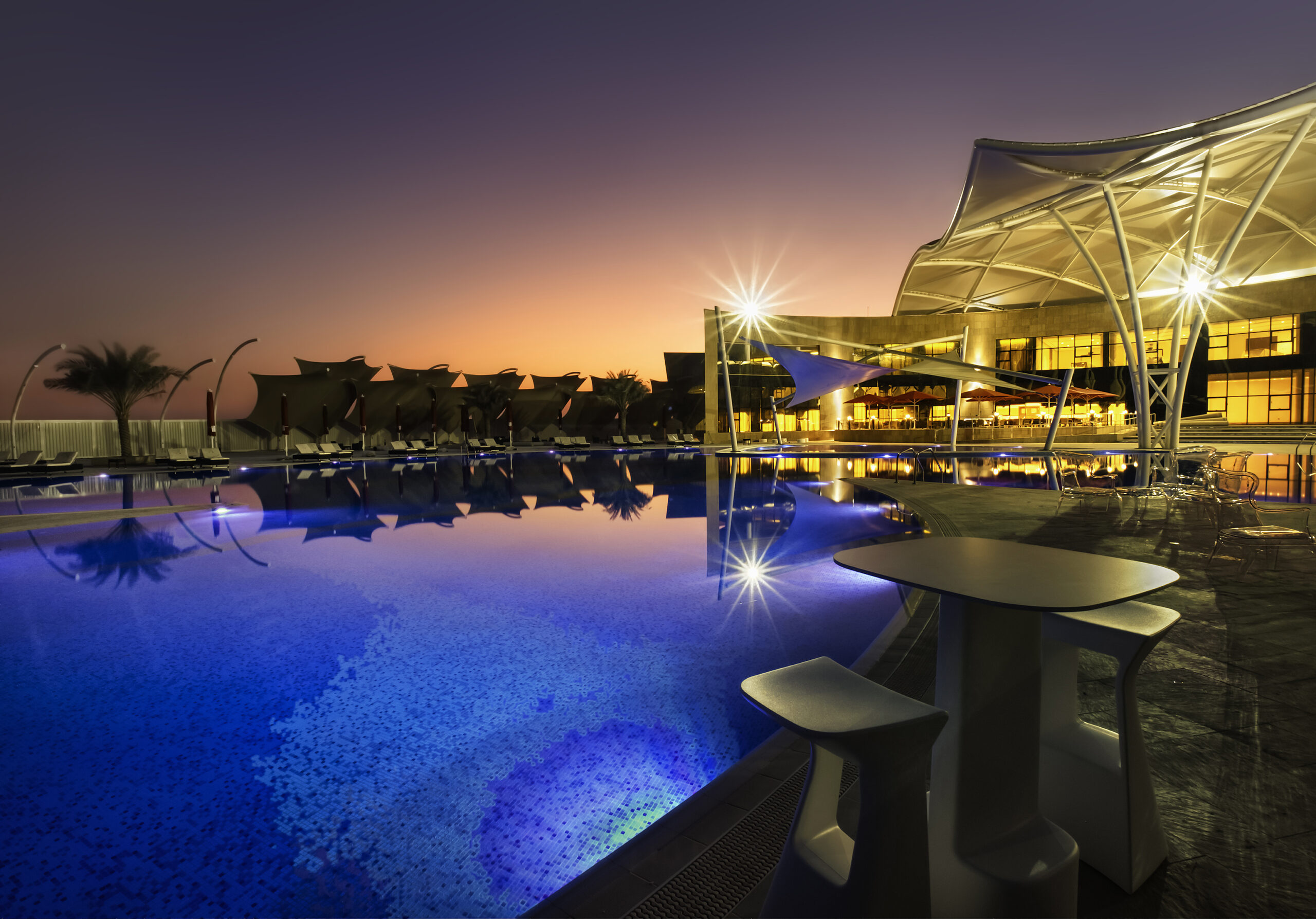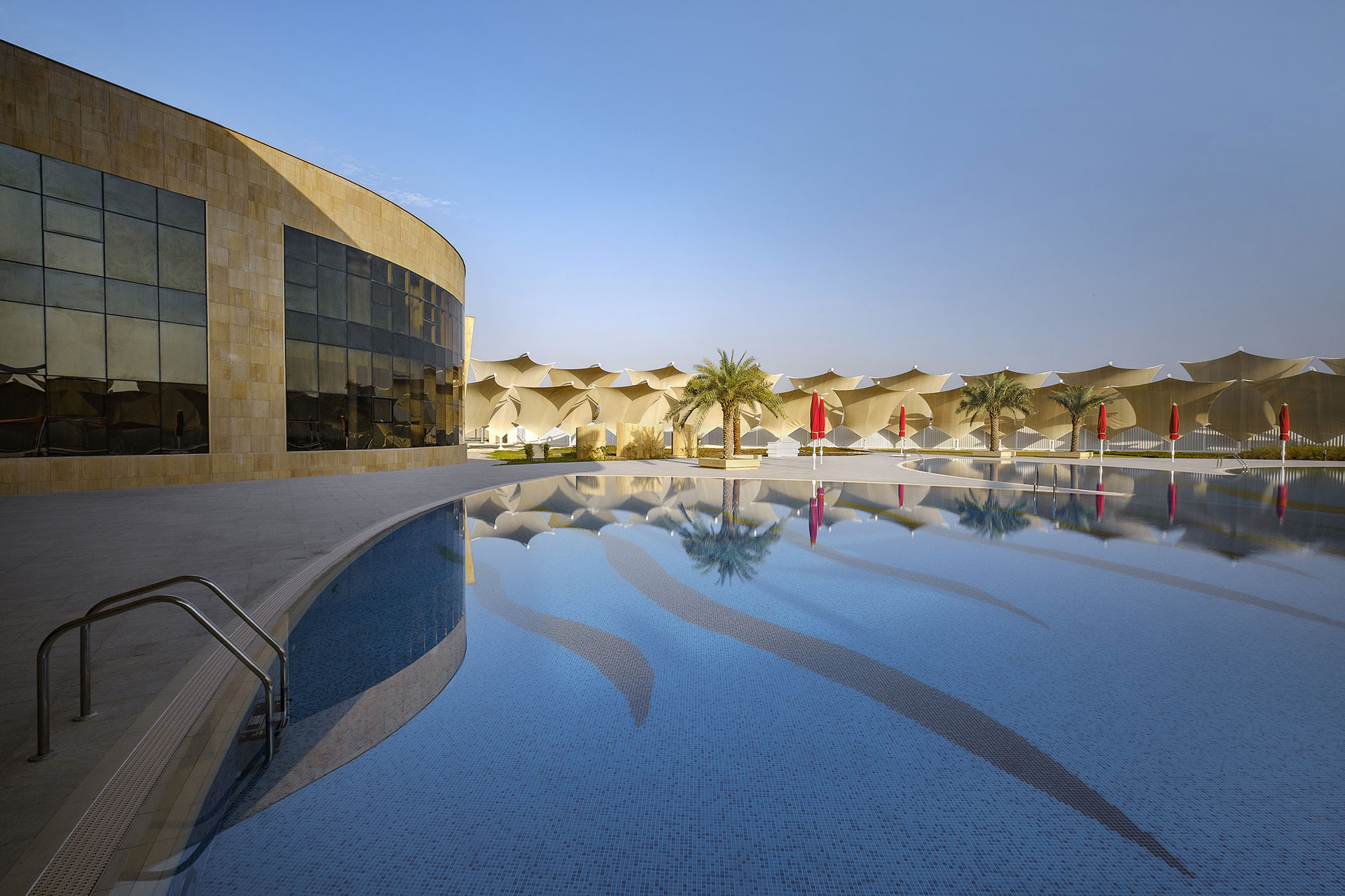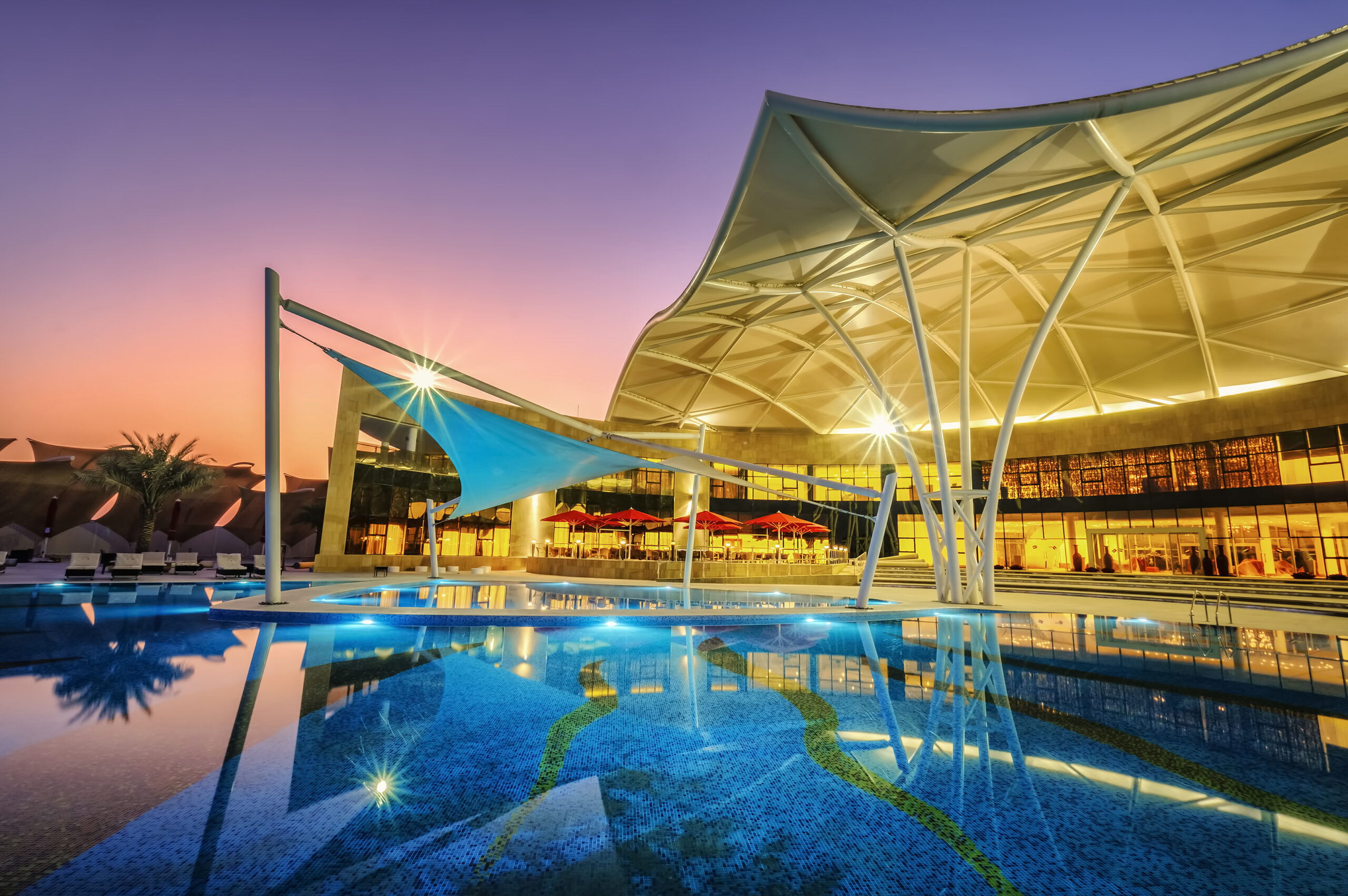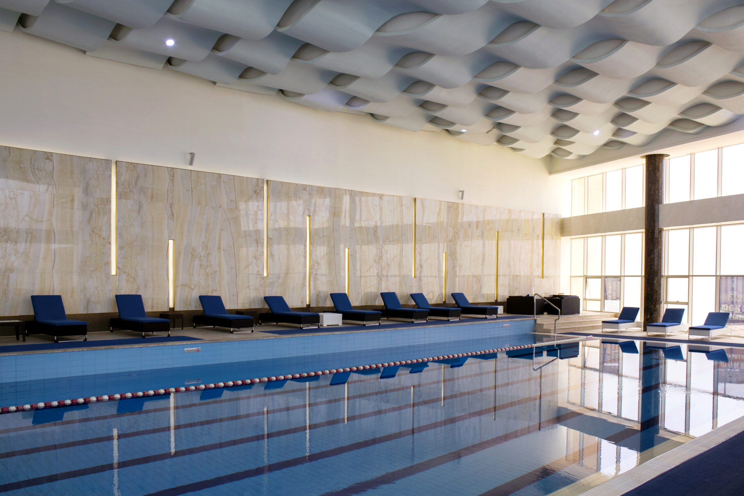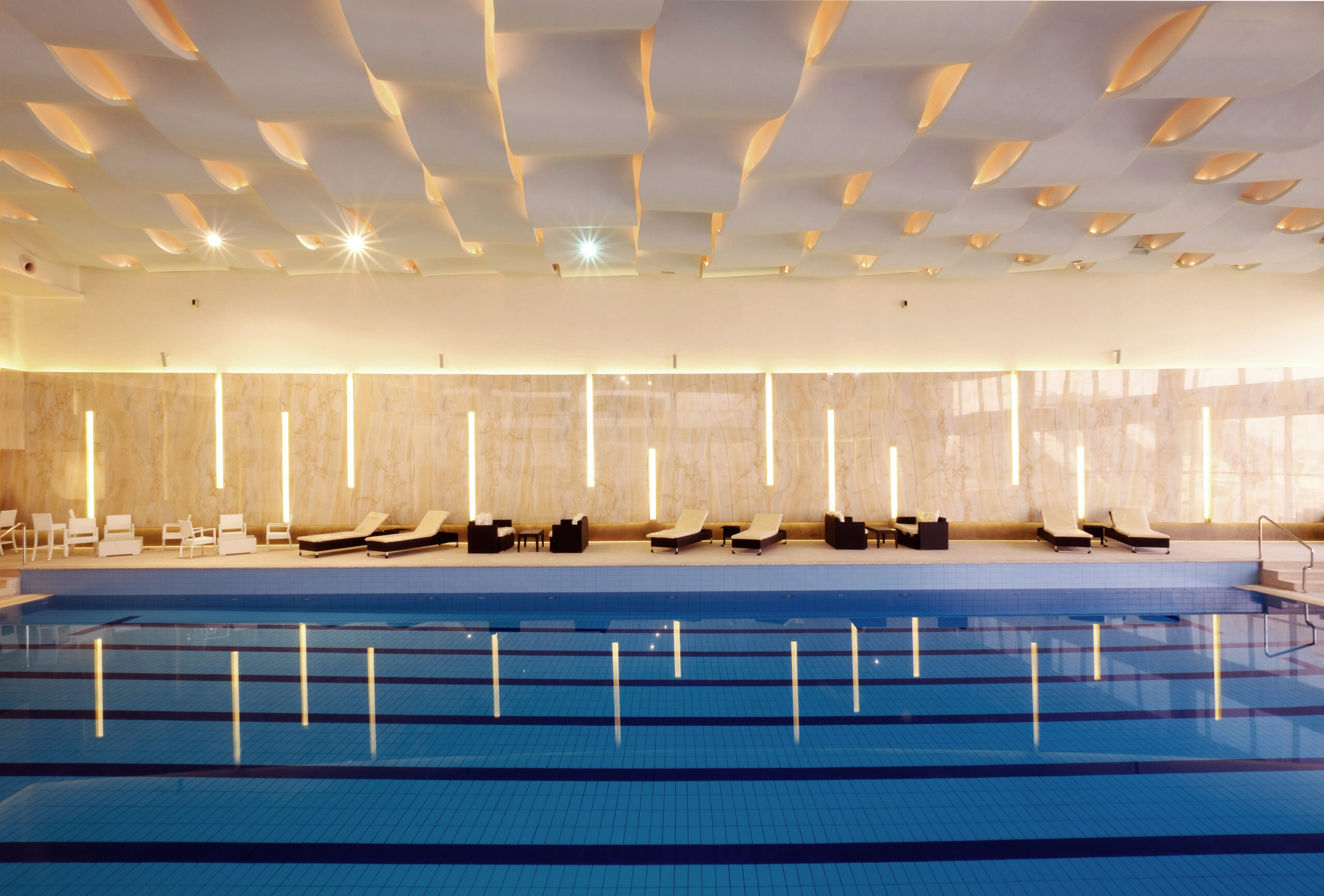 For the high quality and class clubs for ladies, and within the Indoor areas of swimming pools and water sports, the designers were challenged to create a warm cozy indoor pool environment to be added to the existing bright marble walls surrounding the area. The ceiling is designed to be conceived of as cloud-like, both winding and serene at the time to be transcended like a prolonged rain droplet from above through the mesmerizing pool reflections. The solution was to implement a naturally enriched design, gold onyx, blended with a touch of indirect and strip lighting that demonstrated a calm sophistication of a crafted space.