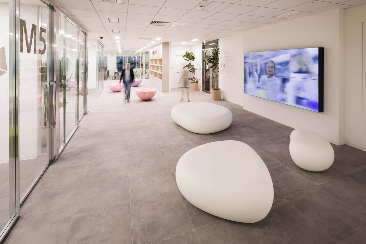 The office area is divided into two main areas. The first, called the “Cyber-garden”, is reminiscent of a Japanese stone garden, and aims to welcome visitors and present the company values and products. Furnishings that bring to mind the shapes of nature, a lounge area and various meeting and seminar rooms follow on in succession between light, transparent partition walls. The second area is reserved for staff, and is in turn divided into three areas, separated by waiting areas with a “forest” theme: a quite work area for concentration, an area for discussions and team work, and a freely available relaxation space. The work stations are designed to optimise the spaces, with a range of options promoting the well-being of the workers. High tables and adjustable stools, flexible desks, modular, adjustable seating, lower tables and counters are positioned to match individual needs with the equipment, ensuring maximum personal comfort.