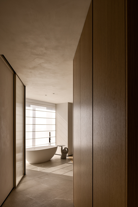 The floor in the living room, in White Aion Maximum, defines a bright, sophisticated base that amplifies the perception of light and spaciousness. The understated white harmoniously matches the minimal furnishings and delicate colour palette, creating a perfect balance of comfort and elegance. White Aion Maximum was also used for the entrance hall and the bath tub area of one of the bedrooms. The choice of uniform textures adds both beauty and function: the visual continuity brings consistency to the project, adding a smooth sense of connection between the spaces.