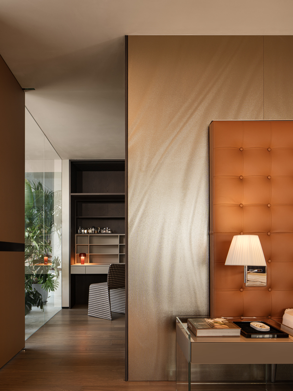 In this context, Fiandre materials were chosen for their ability to interpret and showcase the identity of the spaces. In the bedroom, the main wall is adorned with Luce Gold from the LUCE collection by Guillermo Mariotto, which stands out for its golden shading and luminous surface that helps create an intimate and relaxing atmosphere. This element dialogues perfectly with the neutral hues and smooth textures in the space, offering a feeling of serenity.