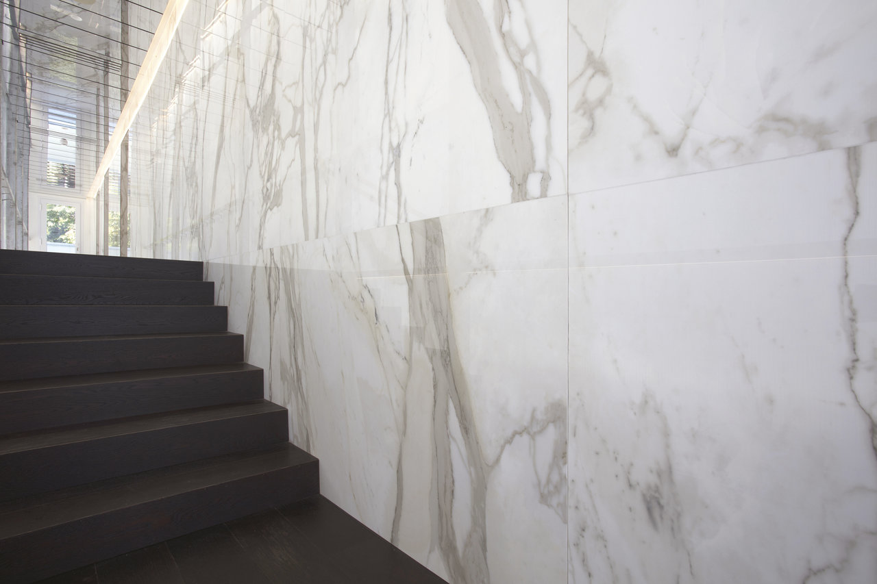 The floors feature Quiet Rock surfaces from the Quietstones Maximum collection with 150×150 cm size slabs plus Calacatta Elite from the Marmi Maximum collection in 300×150 cm large size slabs with a bright finish.