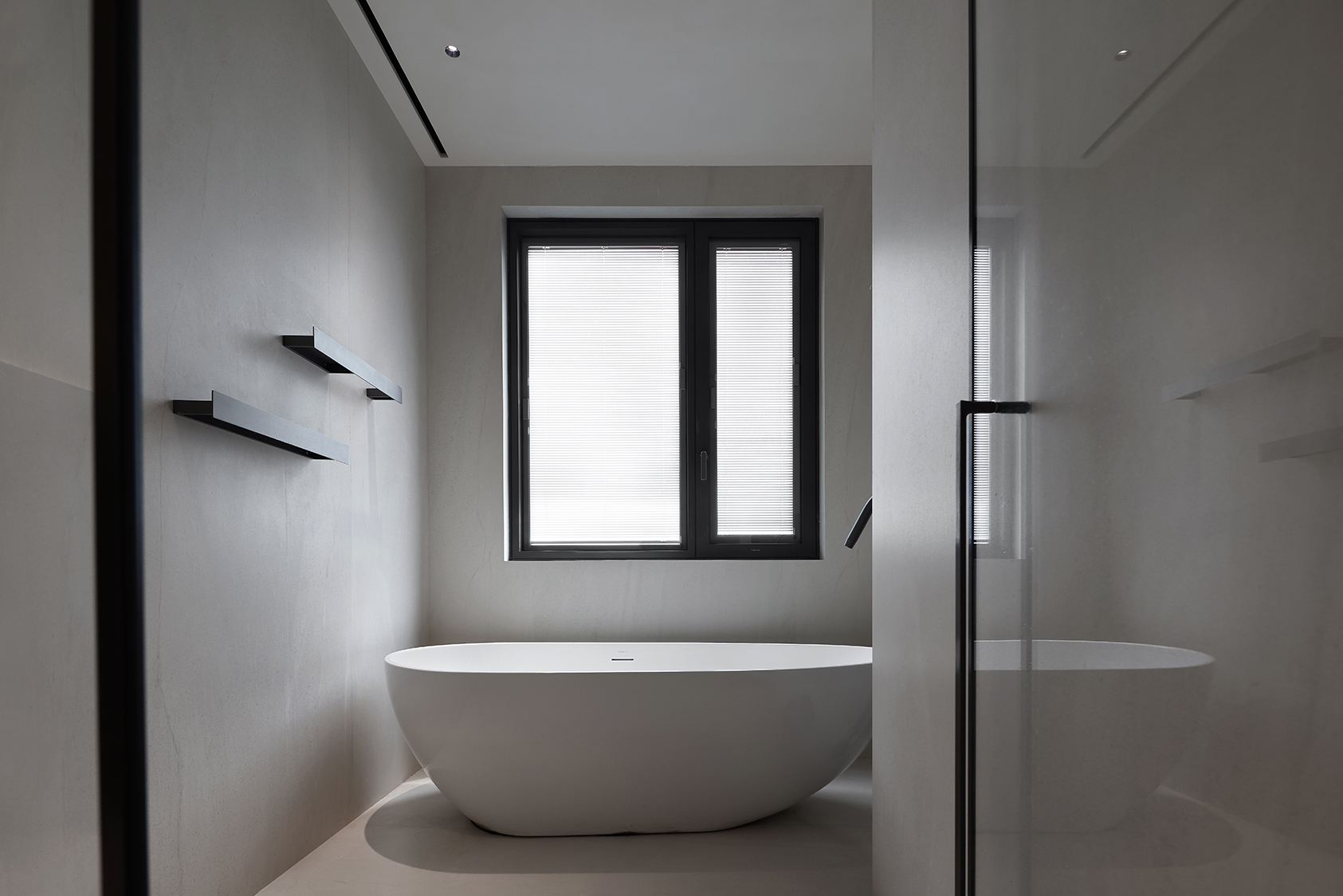 These surfaces stand out for their balanced chromatic rendering, a feature that allows the creationof neutral and sophisticated backgrounds onto which furniture and architectural volumes are integrated. In the bathrooms, porcelain stoneware contributes to creating essential and relaxingenvironments, where large slabs enhance total-look solutions involving floors, wall claddings, furnishings, and work surfaces, while interacting with sculptural sanitary elements such as the freestanding bathtub, emphasizing a sense of order and visual cleanliness.
