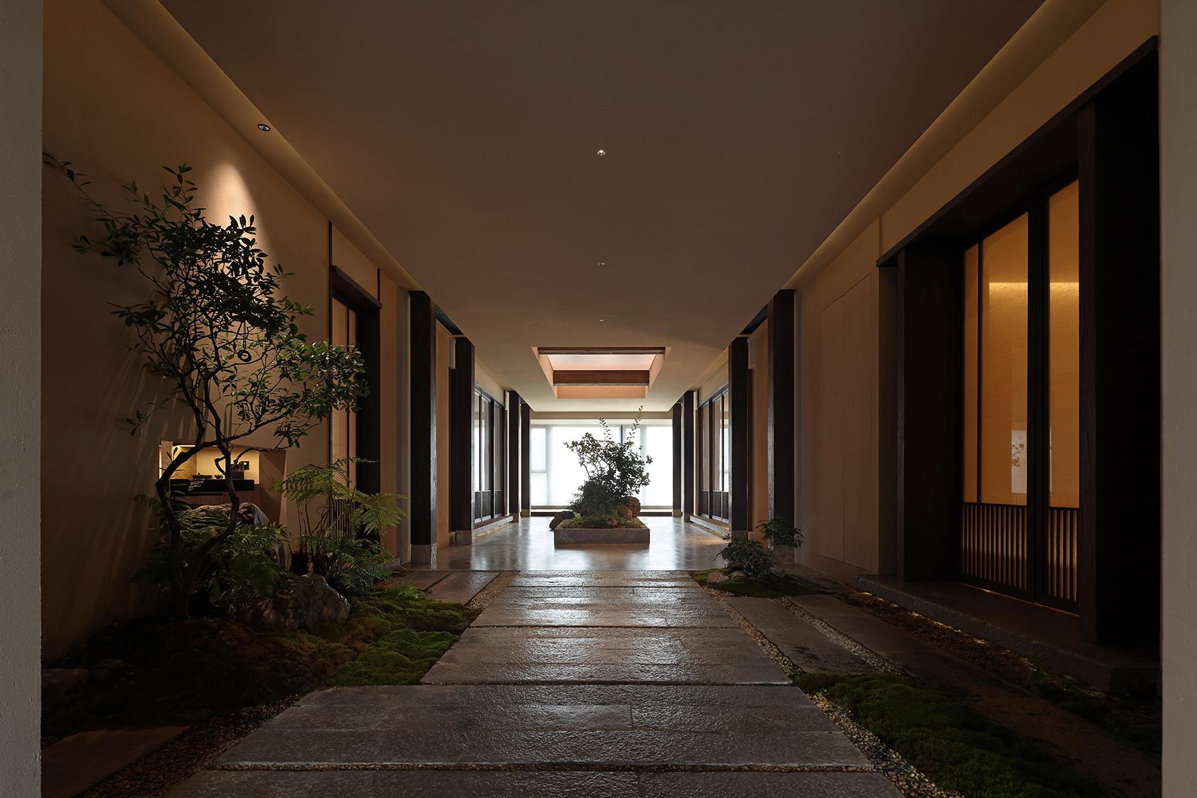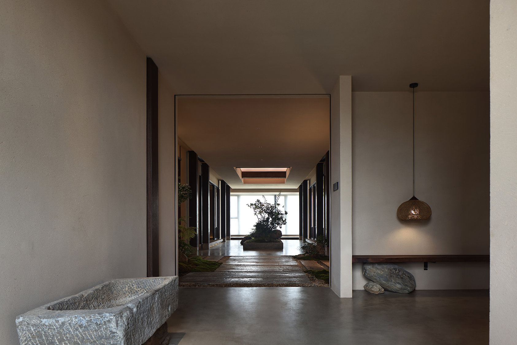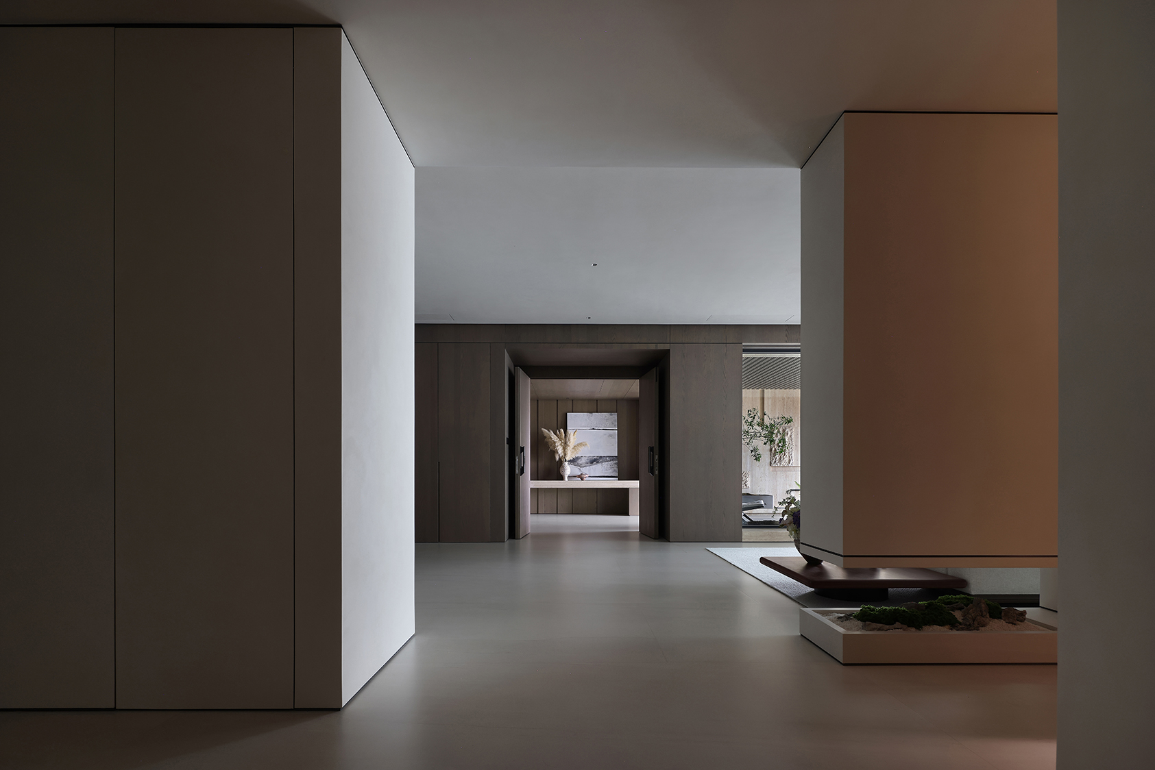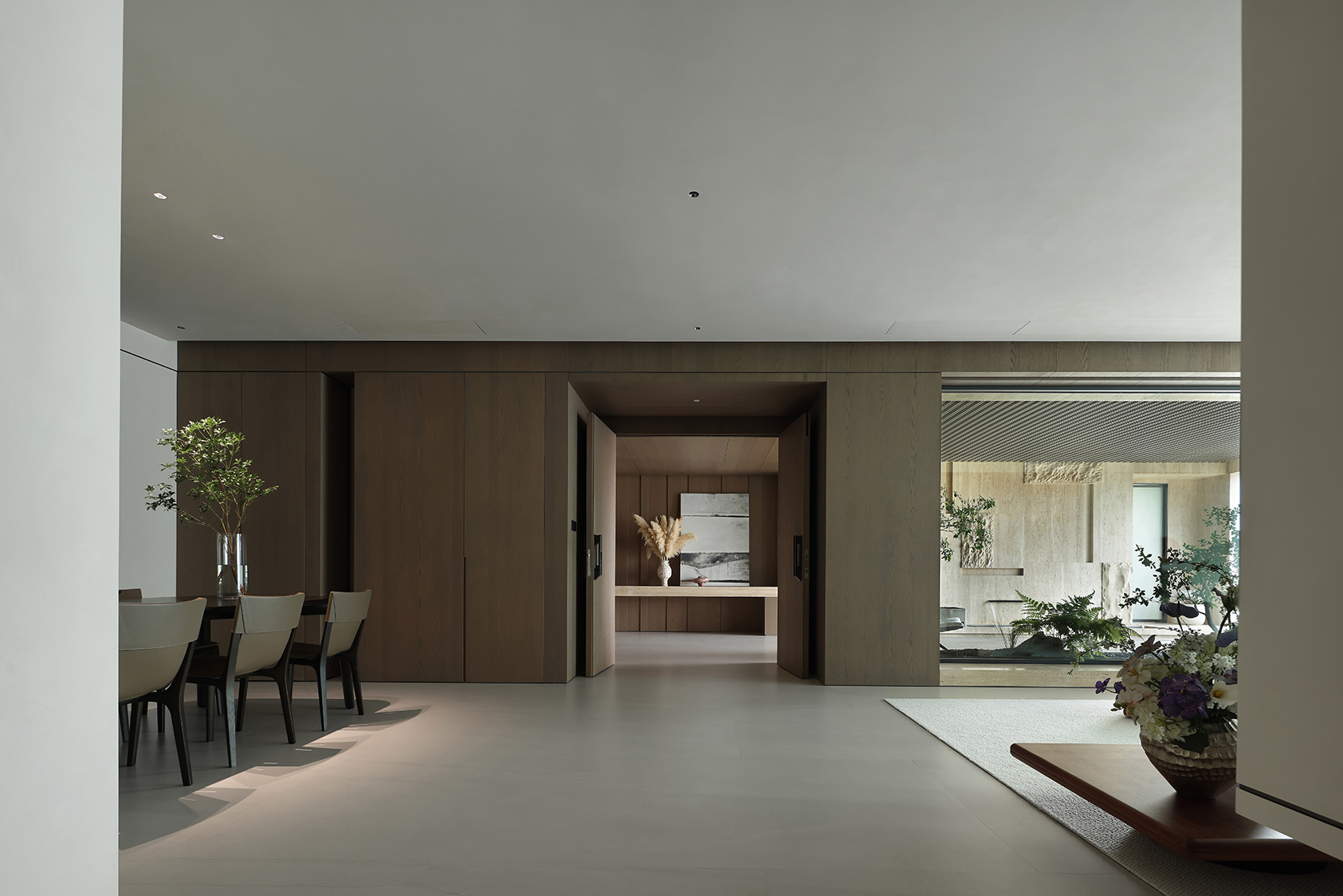 The interior design develops through a refined neutral color palette, where light surfaces and natural textures interact with wooden elements and dark details, creating a balanced interplay of contrasts. Natural light, filtered through large openings, becomes an integral part of the architectural composition, enhancing surfaces and amplifying spatial perception.