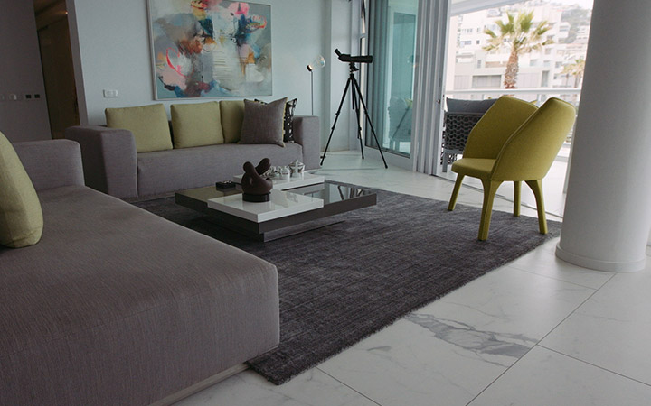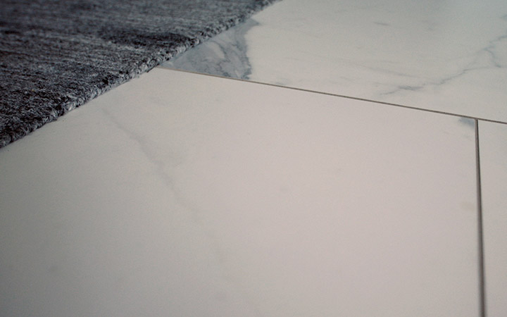 Fiandre Architectural Surfaces porcelain tiles from the collection Calacatta Statuario Marmi Maximum, chosen for dressing the floor of the entire space, provide the perfect refined, blank canvas the architects had in mind, to give the due emphasis to the contemporaneous, colorful art collection of the owners and guarantee a synergic interaction with the scenery.