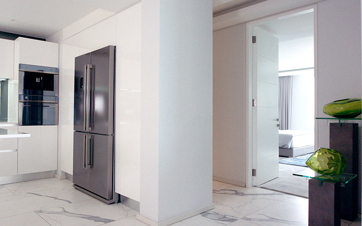 The widespread candor of the marble offers a sophisticated, welcoming shell that becomes particularly vibrant animated by the effects of natural reflections of light and water. The grey veins of the beautiful, classical marble have inspired as a common tread parts of the renovation of interior. The large format of the slates of Calacatta Statuario Marmi Maximum collection, 300x150cm, widens extraordinarily the space, blurring the scale of the apartment and presenting the perfect continuity of an appealing drapery of impeccable purity due to the minimum of joint lines.